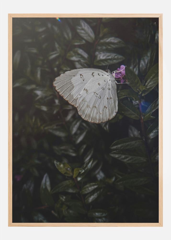 Ανακαλύψτε τη σιωπηλή ομορφιά της φύσης μέσα από αυτήν την αφίσα που απεικονίζει μια ευαίσθητη πεταλούδα σε ανάπαυση. Είναι κομψά τοποθετημένη πάνω σε ένα καταπράσινο φόντο από σκουροπράσινα φύλλα, και τα απαλής λευκής απόχρωσης φτερά της με διακριτικά σχέδια σε γκρι και μαύρο τονίζουν την ευθραυστότητα και τη χάρη της. Αυτή η εικόνα είναι μια ήσυχη υπενθύμιση των φευγαλέων και γοητευτικών στιγμών της φύσης.