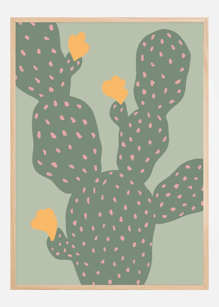 Αυτή η παιχνιδιάρικη και γοητευτική αφίσα απεικονίζει μια στυλιζαρισμένη εικόνα ενός κάκτου με φωτεινές λεπτομέρειες. Με το απαλό πράσινο φόντο της και τις πράσινες φιγούρες κάκτων που διανθίζονται με ροζ τελείες και κίτρινα λουλούδια, η εικόνα προσφέρει μια φρέσκια και χαρούμενη αίσθηση. Αυτή η καλλιτεχνική εκτύπωση συνδυάζει την παιχνιδιάρικη αισθητική με ένα μοντέρνο σχεδιασμό και θα ήταν μια θαυμάσια διακόσμηση τοίχου σε ένα παιδικό δωμάτιο, μια φωτεινή κουζίνα ή ένα δημιουργικό χώρο εργασίας που απαιτεί μια δόση φυσικής έμπνευσης και χρώματος.