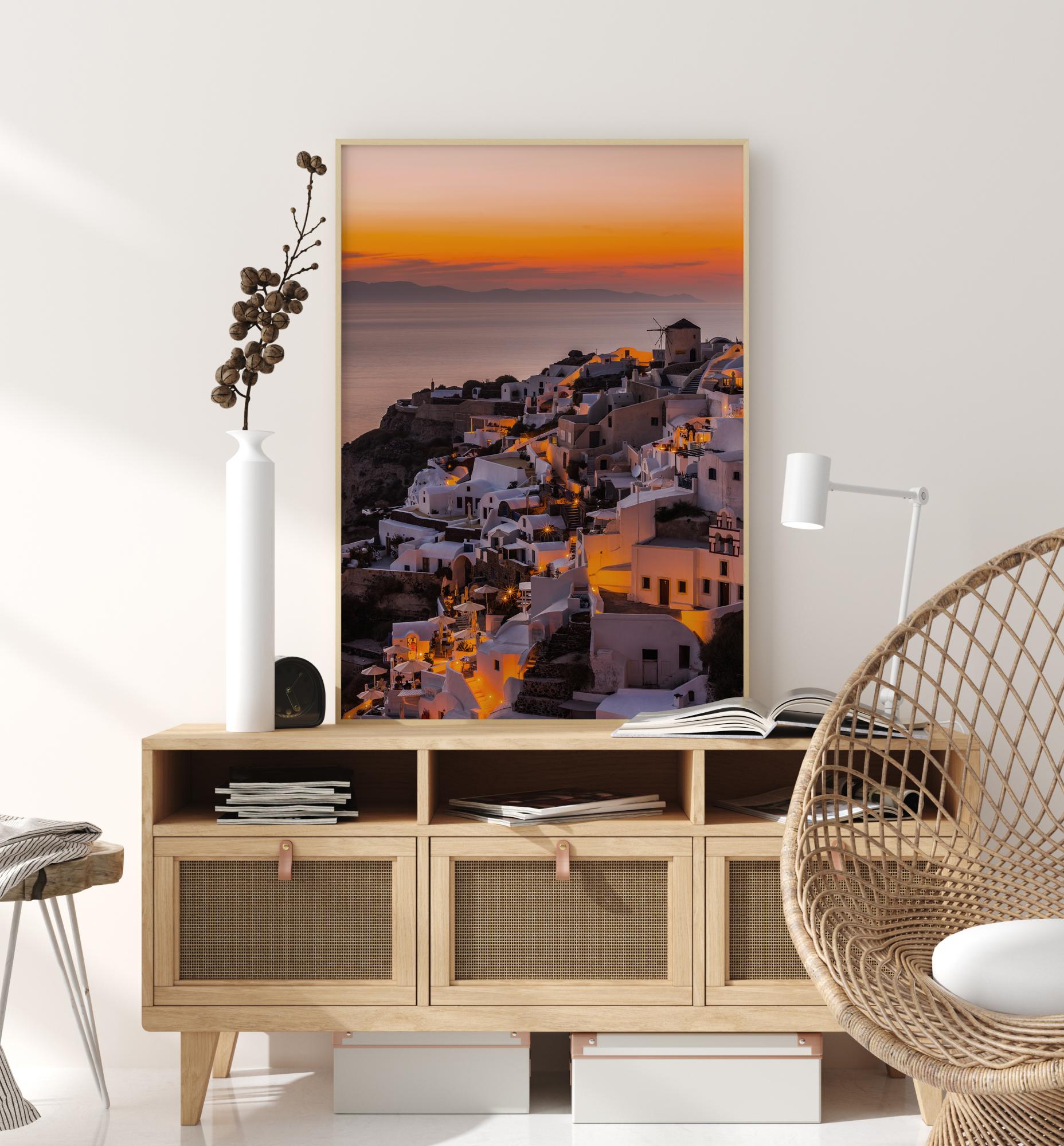 Μια σκηνική αφίσα με την Καλησέρα Σαντορίνη στο ηλιοβασίλεμα. Η μικρή πόλη φωτίζεται απαλά από τα φώτα του δρόμου. Τα λευκά σπίτια ξεχωρίζουν με τη μαλακή, ομιχλώδη θάλασσα και τα βουνά στο βάθος με τον ζωντανό ουρανό στο ηλιοβασίλεμα. Αποδράστε χωρίς να φύγετε από το σπίτι ενώ κοιτάζετε αυτήν την αφίσα.