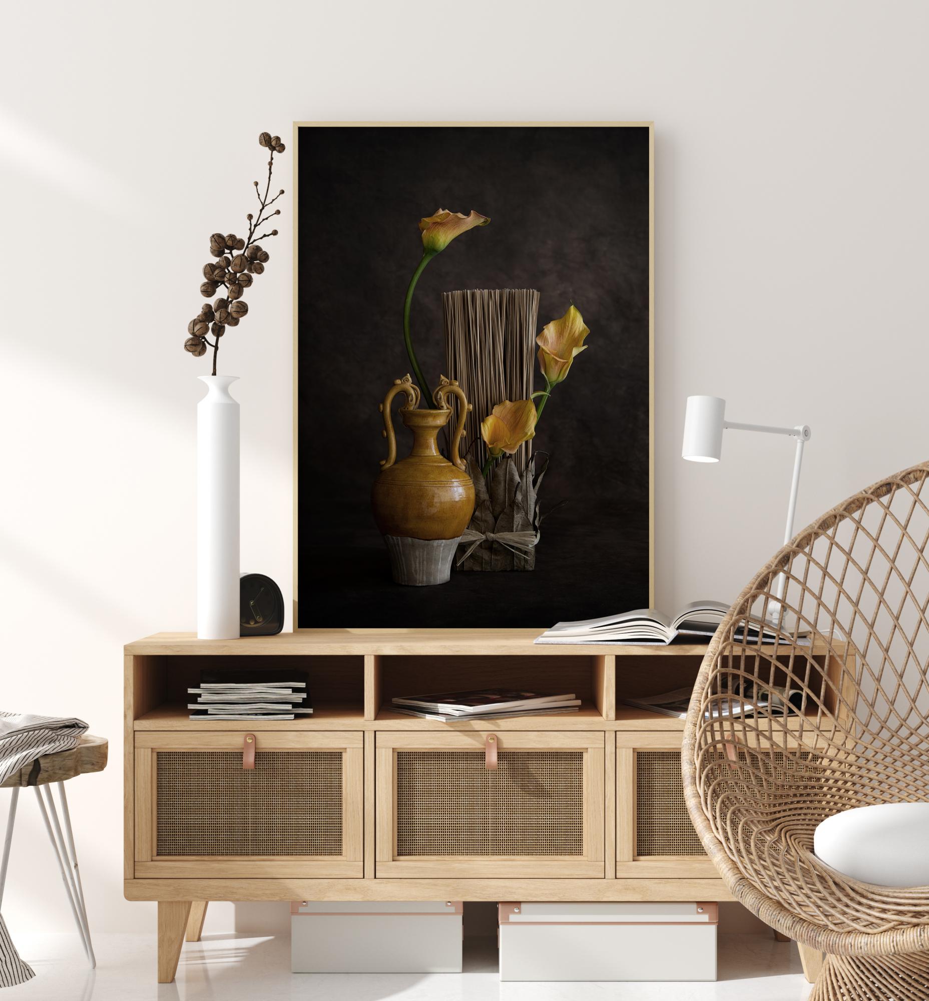 Μια αφίσα stilleben με μια κανάτα, αποξηραμένα καφέ στελέχη και τρία άνθη κρίνα. Ένα μαύρο φόντο κάνει την μουσταρδί κανάτα και τα τρία κίτρινα κρίνα να ξεχωρίζουν έντονα. Ένα κρίνο λυγίζει προς την κορυφή και κατευθύνει το βλέμμα γύρω από το έργο. Κρεμάστε το αυτό για να προσθέσετε μια πινελιά κομψότητας στο σπίτι σας.
