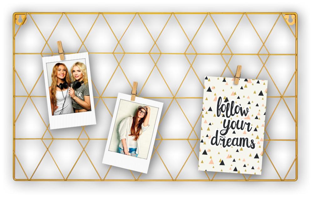 Κορνίζα κολλάζ σχεδιασμένη σαν πίνακας ανακοινώσεων όπου στερεώνετε τις φωτογραφίες σας με κλιπ. Η κορνίζα είναι κατασκευασμένη από μέταλλο και έχει χρυσή απόχρωση. Δεδομένου ότι στερεώνετε εσείς τις εικόνες σας, μπορείτε να επιλέξετε να αναμείξετε φωτογραφίες διαφορετικών μεγεθών και να εκφράσετε τη δημιουργικότητά σας στερεώνοντας, για παράδειγμα, μικρότερες αφίσες ή όμορφα σημειώματα! Η κορνίζα έχει εξωτερικές διαστάσεις 50x30 εκ. Αυτή η κορνίζα ταιριάζει ιδιαίτερα καλά πάνω από το γραφείο, στην κουζίνα ή οπουδήποτε αλλού όπου μπορεί να χρησιμοποιηθεί διακοσμητικά και λειτουργικά. Υπάρχει στήριγμα τοίχου.