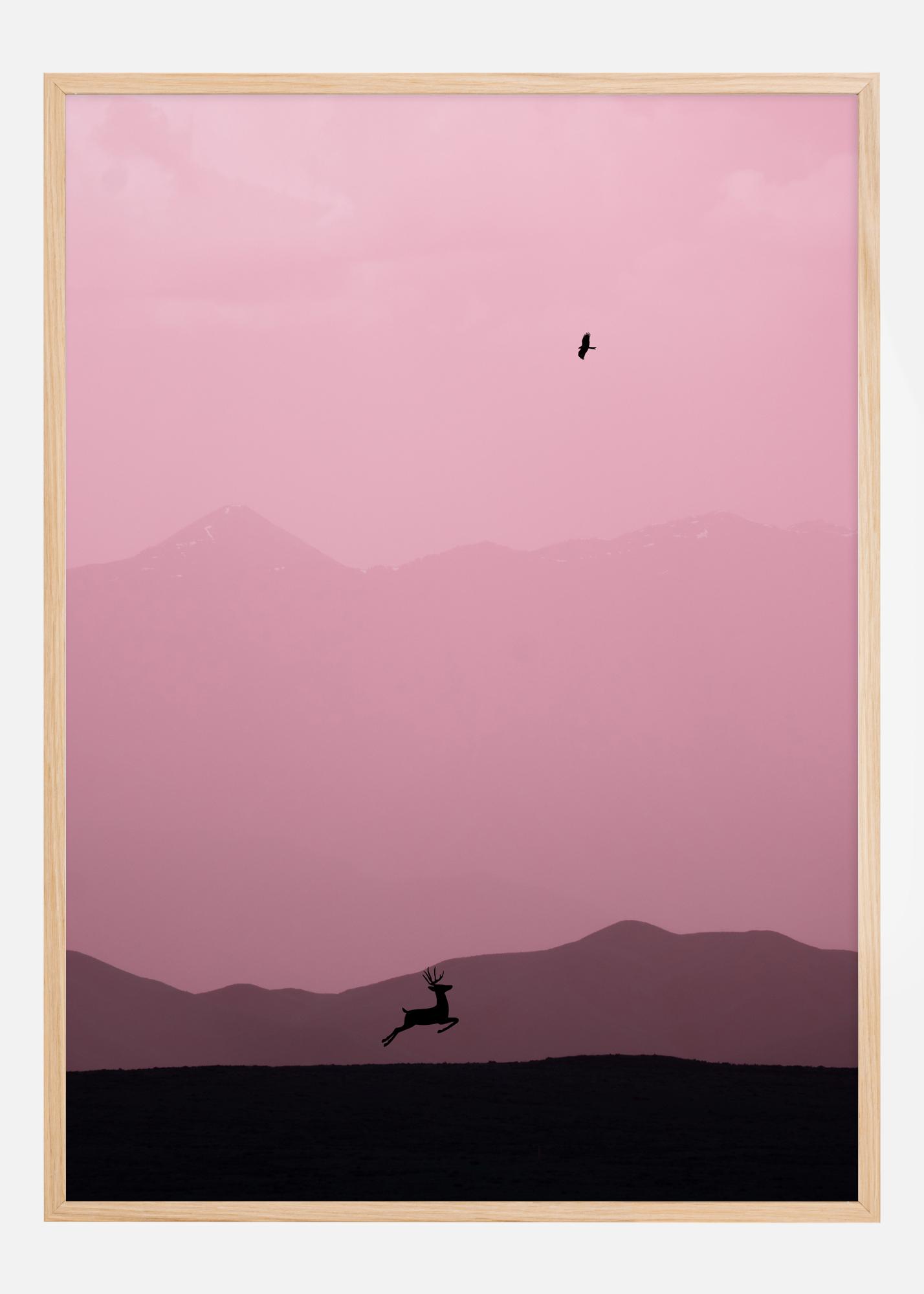Αυτή η ήρεμη και ονειρική αφίσα αποτυπώνει την ουσία της ελευθερίας και της ομορφιάς της φύσης. Μία σιλουέτα ενός ελαφιού σε ένα άλμα πάνω από τη σιλουέτα απαλά κυματιστών λόφων προσφέρει μια αίσθηση κίνησης και ελαφρότητας. Πάνω από όλα εκτείνεται ένας απαλός ροζ ουρανός που προσθέτει μια αίσθηση ζεστασιάς και δέους. Ένα μοναχικό πουλί πετά προς την απεραντοσύνη του ουρανού, προσθέτοντας μια επιπλέον διάσταση ελευθερίας και ανεξαρτησίας στην εικόνα.