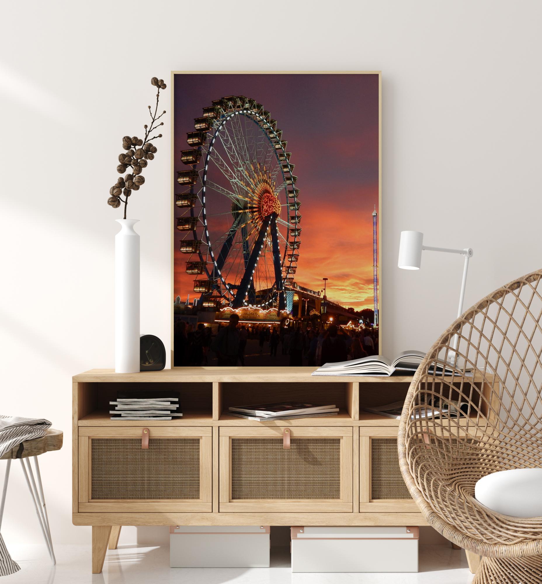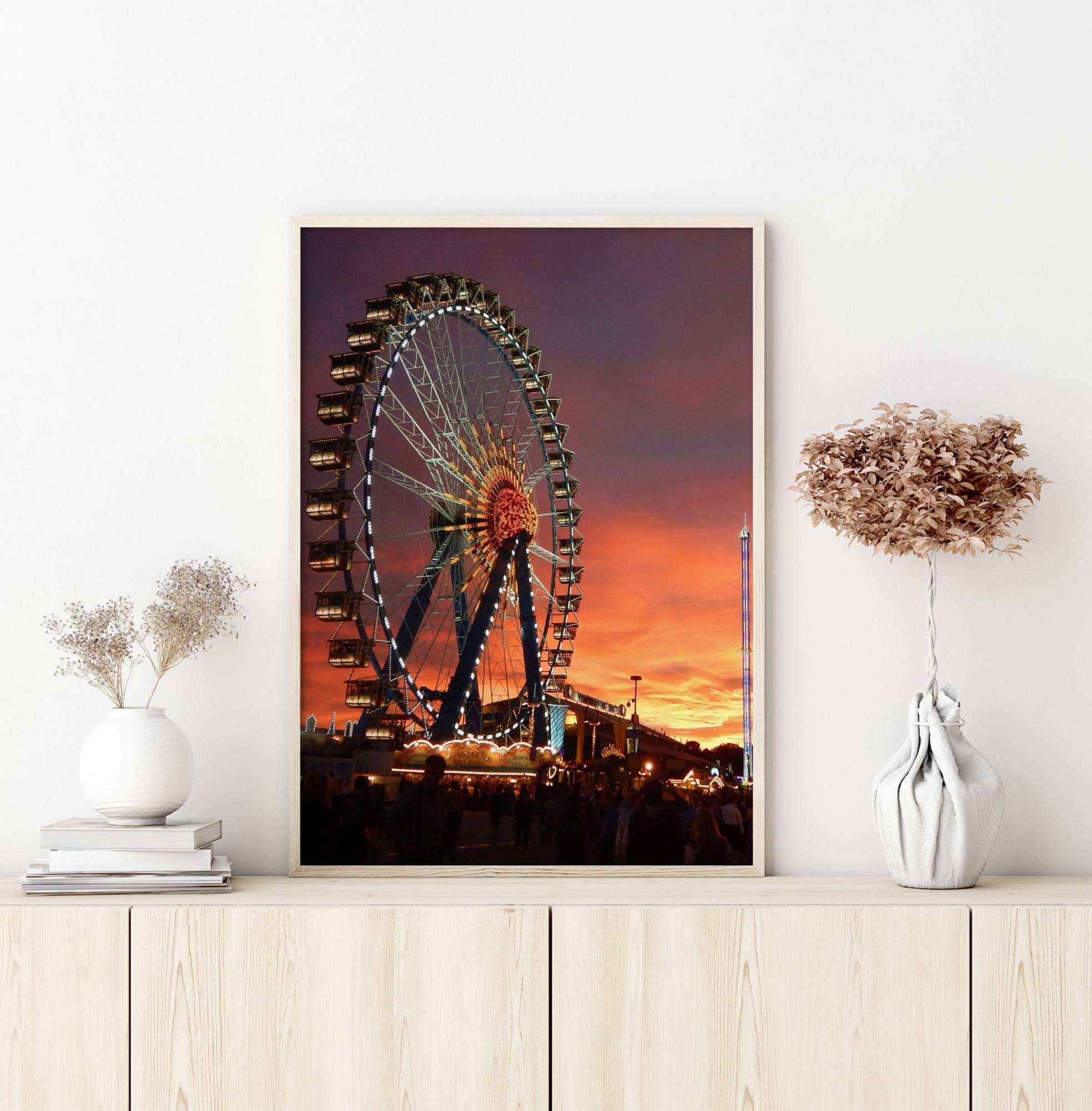 Μια φανταστική αφίσα με μια ρόδα λούνα παρκ τη νύχτα. Στα αριστερά βρίσκεται η ρόδα που λάμπει με μια φωτεινή λάμψη. Από κάτω, τα πλήθη κοιτούν τη ρόδα ενώ ο ήλιος δύει σε έναν υπέροχο πορτοκαλί και μωβ νυχτερινό ουρανό. Προσθέστε λίγο νυχτερινό δράμα στους τοίχους σας με αυτή την αφίσα.