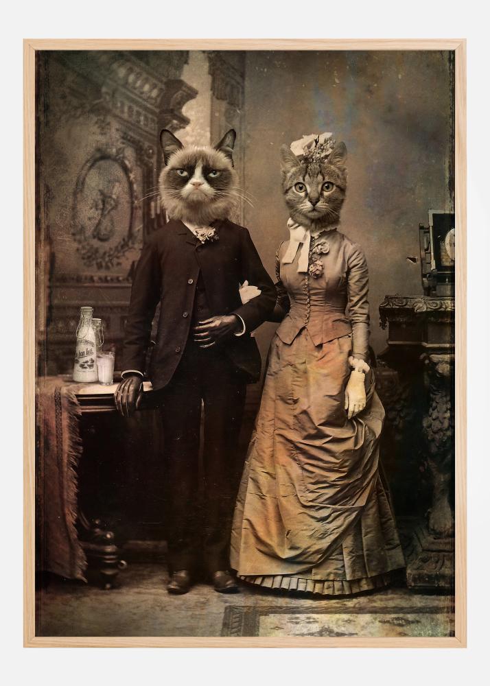 Μια κωμική αφίσα που δείχνει ένα ζευγάρι γάτες ντυμένες με βικτοριανά ρούχα. Ο κατσούφης γάτος και η νύφη του στέκονται σε πλήρη βικτοριανή μόδα συμπεριλαμβανομένου του κοστουμιού και του κορσέ σε αυτή τη σεπία εκτύπωση. Φέρτε λίγο γέλιο στο σπίτι σας με αυτή την εικόνα στον τοίχο του καθιστικού σας.