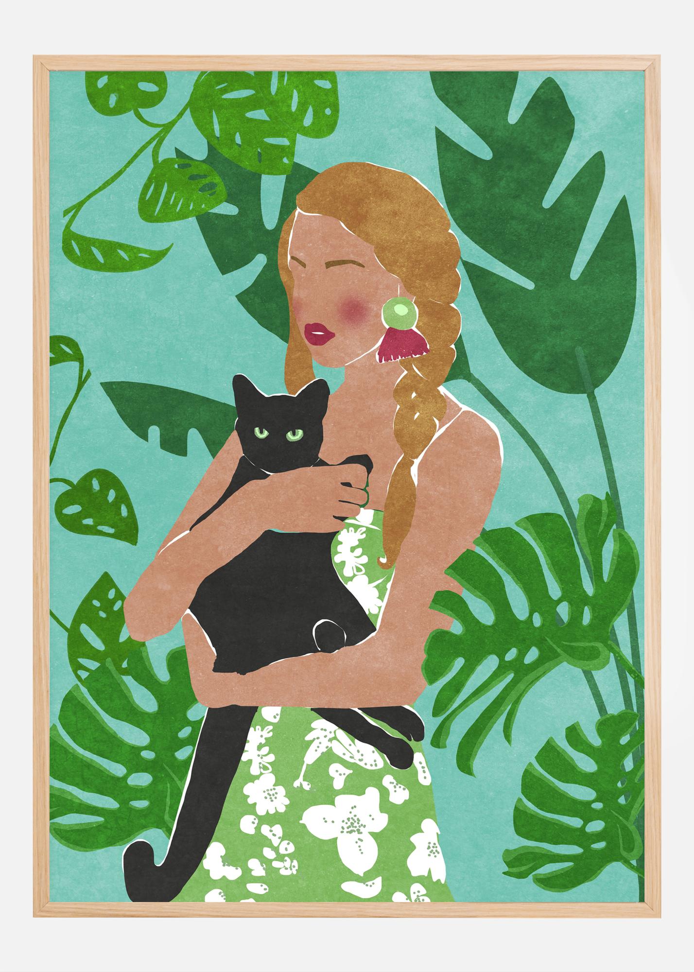 Στην αφίσα κυριαρχούν ήρεμοι και γήινοι τόνοι. Οι πράσινες αποχρώσεις από τα φυτά και το φόντο προσφέρουν μια γαλήνια αντίθεση με τις μπεζ και καφέ αποχρώσεις της γυναίκας και το βαθύ μαύρο χρώμα της γάτας. Οι λεπτομέρειες στο λευκό φόρεμα με λουλουδάτο μοτίβο προσθέτουν ελαφρότητα στη σύνθεση. Η αφίσα περιβάλλεται από ένα ξύλινο πλαίσιο (δεν περιλαμβάνεται στο θέμα) που ενισχύει περαιτέρω τη φυσική αίσθηση. Αυτή είναι μια εκτύπωση που δεν αποτελεί μόνο μια όμορφη λεπτομέρεια διακόσμησης, αλλά και μια έκφραση φιλικότητας προς τα ζώα και ένας φόρος τιμής στις απλές χαρές της ζωής.
