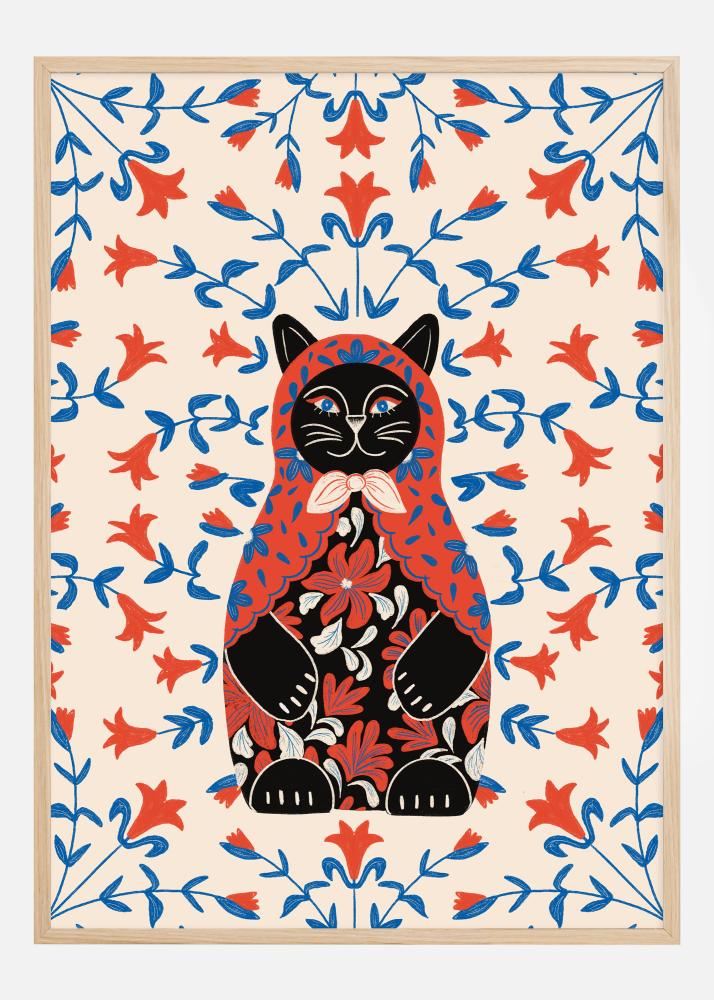 Αυτή η πολύχρωμη και ζωντανή αφίσα είναι μια σύγχρονη ερμηνεία της κλασικής ρωσικής ματριόσκας, επαναφαντασμένη ως μια μεγαλοπρεπής γατομορφή που κάθεται στο κέντρο περιβαλλόμενη από έναν πλούσιο ανθόκηπο. Το βλέμμα της γάτας είναι διεισδυτικό και μυστηριώδες, ενώ το τρίχωμά της είναι πλούσια διακοσμημένο με περίπλοκα λουλουδάτα μοτίβα. Γύρω από τη γάτα, εκτείνεται μια θάλασσα από κόκκινα και μπλε λουλούδια σε μια κρεμ φόντο, δημιουργώντας ένα σχεδόν υπνωτιστικό μοτίβο που είναι τόσο συναρπαστικό όσο και όμορφο.