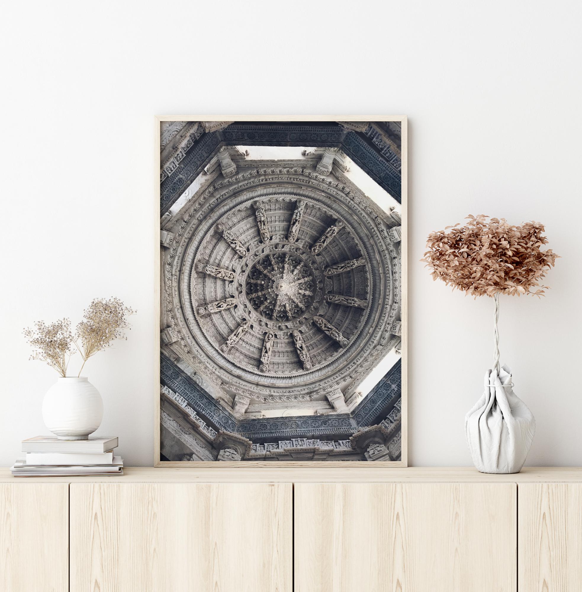 Μια ασπρόμαυρη αφίσα με μια γκρίζα οροφή. Η οροφή είναι σχεδιασμένη με κύκλους και μοιάζει με τροχό πλοίου. Περιτριγυρισμένη από ένα οκτάγωνο, έχει γεωμετρικά σχήματα παντού. Δώστε σε έναν απαλό μπλε τοίχο λίγη επιπλέον ζωντάνια κρεμώντας αυτήν την αφίσα οροφής.