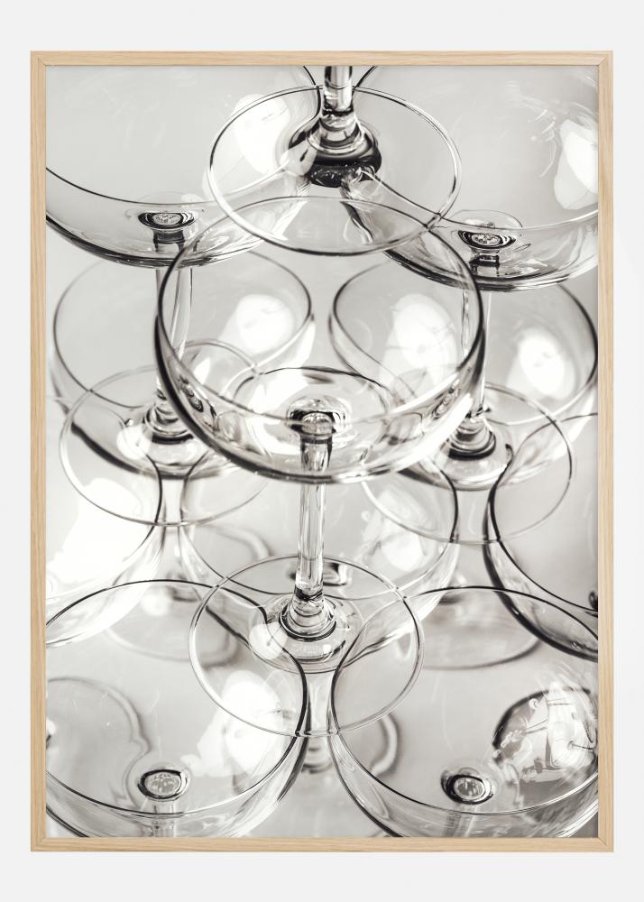 Αυτή η κομψή και εκλεπτυσμένη αφίσα συλλαμβάνει την ομορφιά και την καθαρότητα μιας καταιγίδας από ποτήρια σαμπάνιας. Η εικόνα απεικονίζει ένα κοντινό πλάνο της περίπλοκης δομής του γυαλιού, όπου το φως αντανακλάται και διαθλάται μέσα από το διαφανές υλικό, δημιουργώντας έναν χορό φωτός και σκιών. Η λεπτομέρεια και η εύθραυστη ακρίβεια της σύνθεσης αναδεικνύει τις λεπτές φόρμες των ποτηριών και τις υποτονικές αποχρώσεις του γυαλιού.