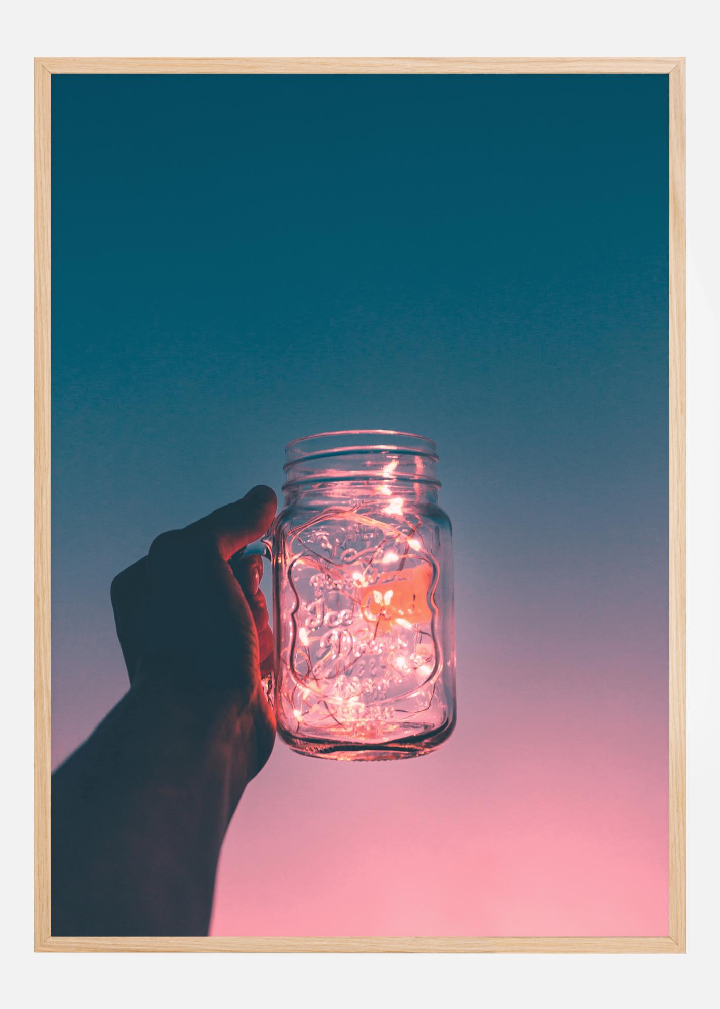 Μια ωραία αφίσα με ένα χέρι που κρατά ένα γυάλινο κούπα με φώτα LED. Απολαύστε τη μαγική ατμόσφαιρα ενός απαλού μπλε και ροζ φόντου, που δίνει στο έργο μια πραγματική αίσθηση φαντασίας. Σηκώστε το ποτήρι σας σε αυτή την εικόνα και νιώστε την αναζωογονητική αίσθηση που δίνει αυτή η αφίσα.