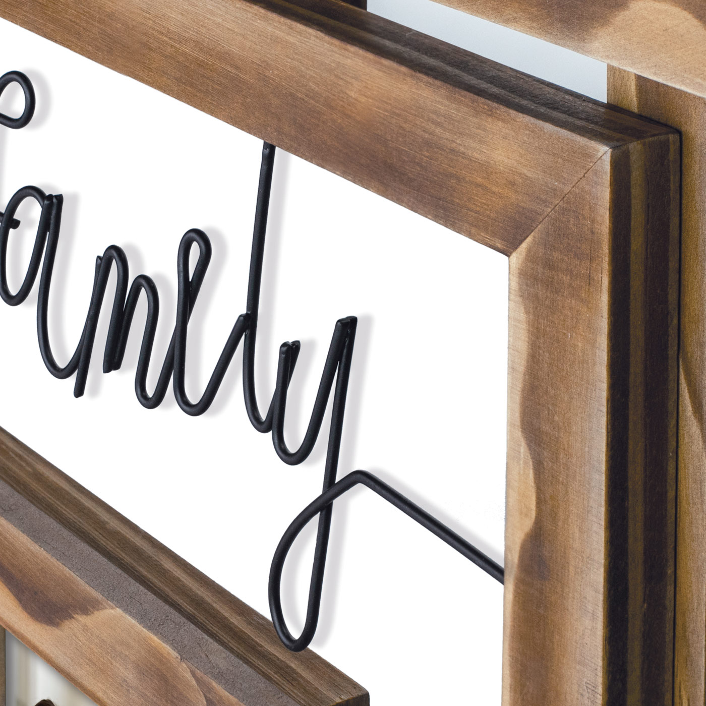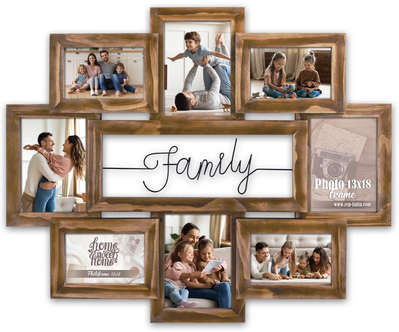Αυτή η όμορφη κορνίζα κολάζ είναι τέλεια για να αναδείξετε τις καλύτερες αναμνήσεις με την οικογένεια και να τις κορνιζάρετε! Η κορνίζα κολάζ έχει μια ζεστή απόχρωση ξύλου σε καφέ και στο κέντρο ανάμεσα στις κορνίζες εμφανίζεται η λέξη "οικογένεια" με μαύρα γράμματα. Η κορνίζα χωράει 8 εικόνες σε μέγεθος 10x15 εκ. και 13x18 εκ. Διαθέτει στήριγμα τοίχου.