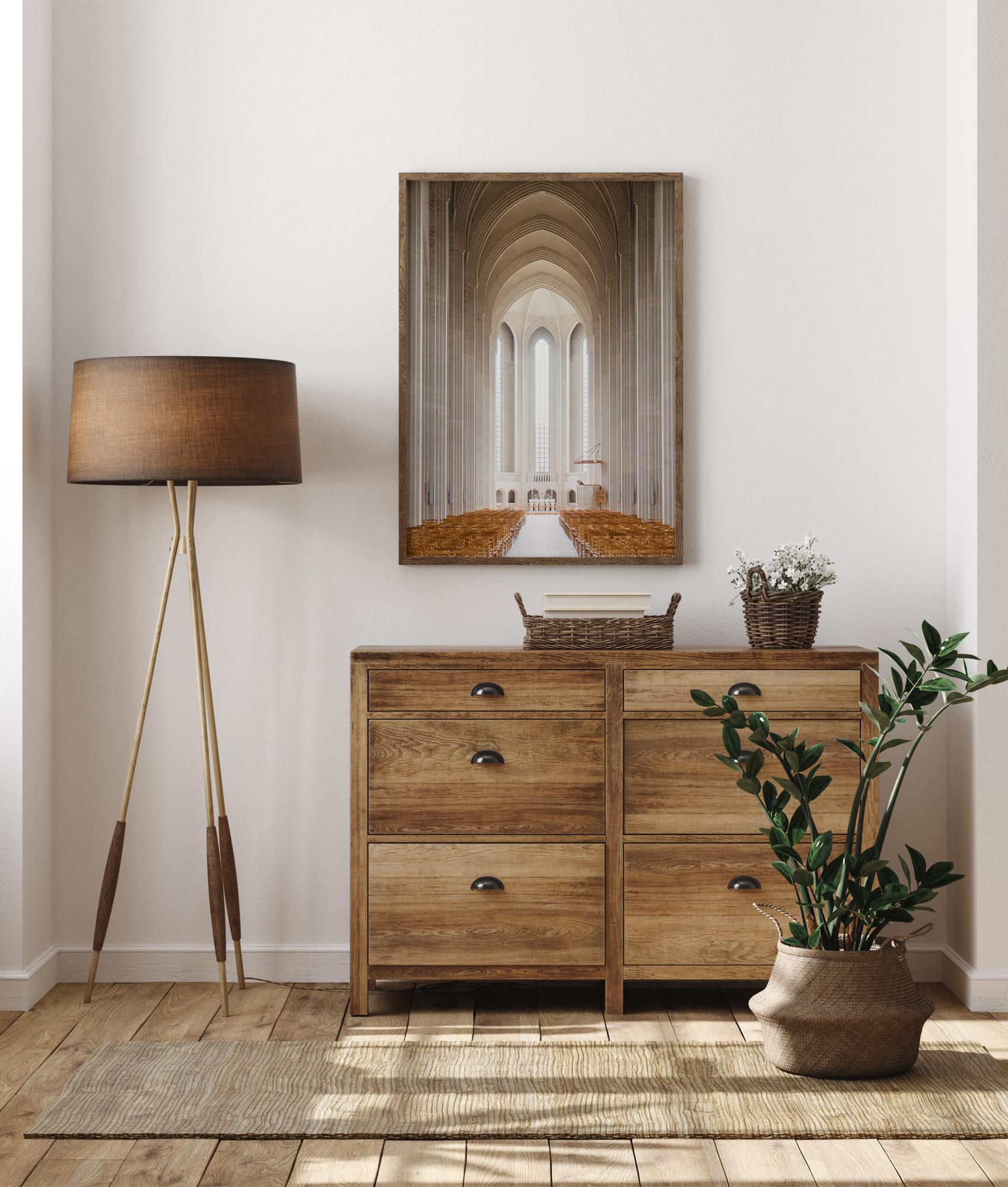 Μια ρομαντική αφίσα του εσωτερικού μιας εκκλησίας. Καφέ ανοιχτές καρέκλες ευθυγραμμίζονται με τον διάδρομο σε μακριές σειρές από κάθε πλευρά. Οι γοτθικές καμάρες πλαισιώνουν το έργο, οδηγώντας το βλέμμα προς το φωτεινό λευκό φως στο τέλος του διαδρόμου της εκκλησίας. Πηγαίνετε στην εκκλησία από το σπίτι όταν έχετε αυτήν τη θρησκευτική αφίσα να κρέμεται στο σπίτι.