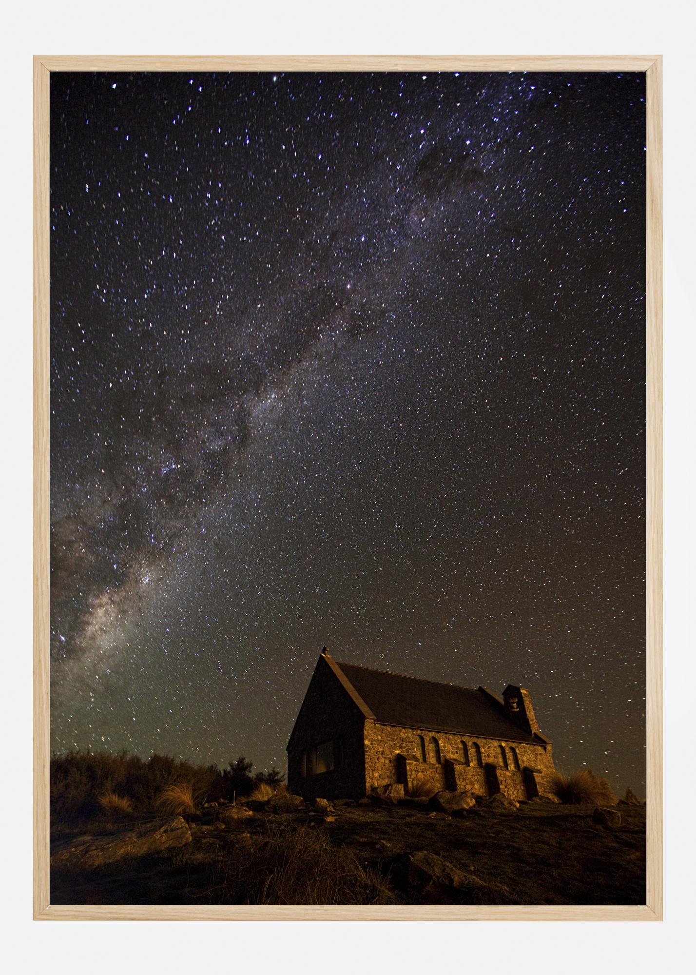 Μια θρησκευτική αφίσα μιας παλιάς πέτρινης εκκλησίας με τον Γαλαξία στο παρασκήνιο. Η ρουστίκ εκκλησία φωτίζεται από ένα απαλό φως σε έναν λόφο. Ο φωτεινός νυχτερινός ουρανός είναι γεμάτος με μικρά αστέρια που αποτελούν το γαλαξία μας από πάνω. Νιώστε τον σεβασμό μπροστά στο σύμπαν μας σε αυτήν την εικόνα.