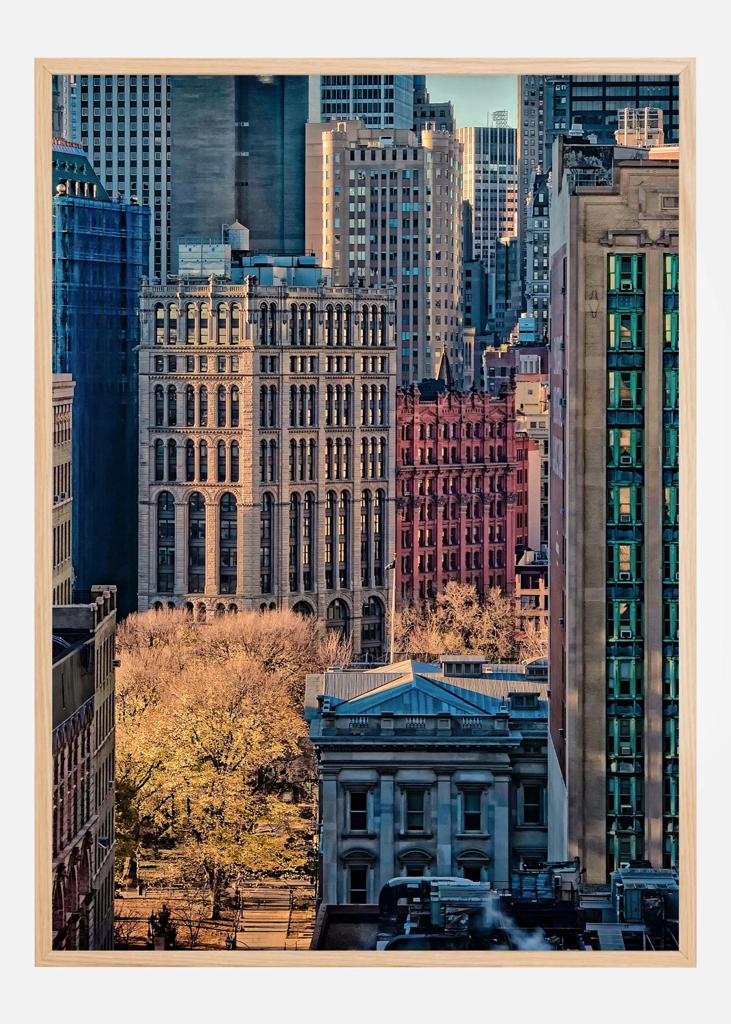 Μια αφίσα αστικού τοπίου με παλιά και νέα κτίρια. Τα φθινοπωρινά δέντρα και τα κόκκινα τούβλινα κτίρια δημιουργούν μια εντυπωσιακή αντίθεση με τους ψυχρότερους μπλε ουρανοξύστες. Φανταστείτε να κοιτάζετε έξω από το παράθυρό σας αυτό το πολυσύχναστο αστικό μέρος καθώς έχετε αυτή την εικόνα στο σπίτι σας.