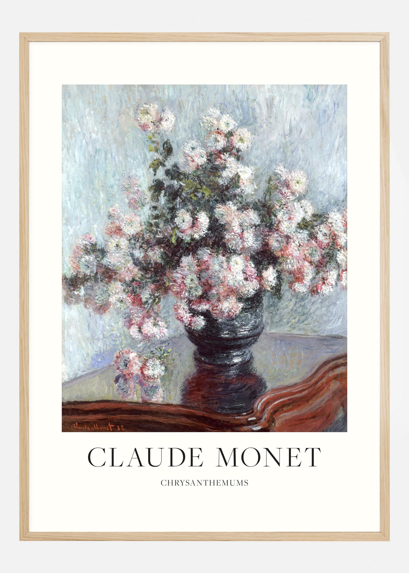 Θαυμάστε το βάθος και την υφή της 'Χρυσανθέματα' του Claude Monet, μια αφίσα που δείχνει την μοναδική του ικανότητα να αποτυπώνει την ουσία της φύσης. Αυτή η ευαίσθητη αναπαράσταση χρυσανθέμων σε ένα βάζο είναι μέρος του ευρύτερου έργου του Monet που υμνεί την ομορφιά του λουλουδιού. Ο πίνακας, που χρονολογείται στο 1892, αποδίδει την απαλότητα και τις μεταβαλλόμενες αποχρώσεις των λουλουδιών με μια ιμπρεσιονιστική τεχνική που δημιουργεί μια σχεδόν ονειρική κατάσταση στον παρατηρητή. Η παλέτα χρωμάτων είναι μια ισορροπία από λεπτές ροζ και λευκές αποχρώσεις ενάντια σε ένα ατμοσφαιρικό μπλε φόντο, δημιουργώντας μια αίσθηση γαλήνης και ομορφιάς.