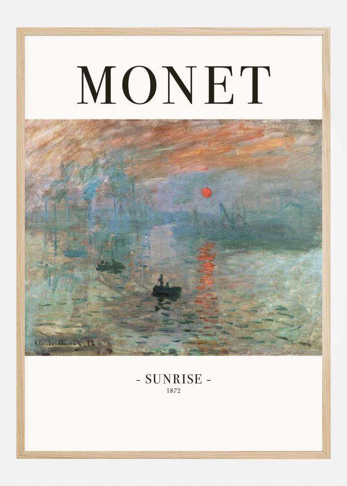Αυτή η αφίσα αντικατοπτρίζει το αριστούργημα του Claude Monet 'Εντύπωση, Ανατολή του Ήλιου', ο πίνακας που έδωσε το όνομά του στον ιμπρεσιονισμό. Από το 1872, αυτό το έργο προσφέρει μια ομιχλώδη θέα του λιμανιού της Χάβρης κατά την αυγή, όπου ο ήλιος είναι μια αιμάτινη σφαίρα που ρίχνει το ανακλαστικό φως του στα ήρεμα νερά. Οι απαλές αλλά σταθερές πινελιές του Monet και η ονειρική χρωματική παλέτα δημιουργούν μια αίσθηση ηρεμίας και προσδοκίας που φέρνει κάθε νέα μέρα.