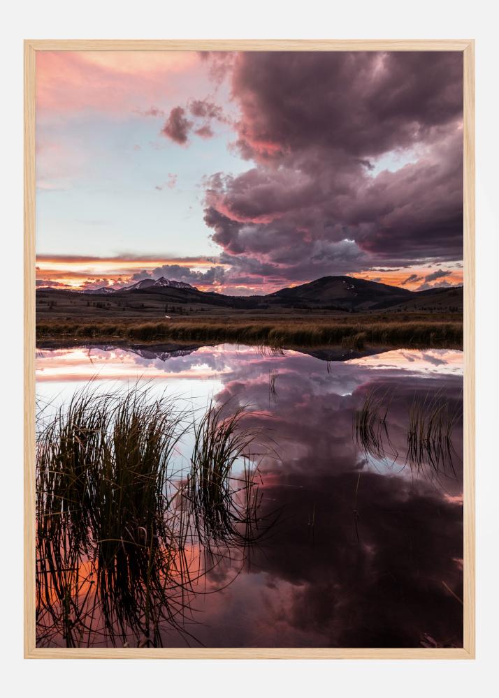 Μια αφίσα τοπίου με μια λίμνη, καλάμια και φανταστικά σύννεφα στον ορίζοντα. Τα καλάμια στέκονται στη λίμνη και κυματίζουν στον άνεμο ενώ μεγάλα σύννεφα κυλούν από πάνω και αντανακλώνται στην επιφάνεια του νερού. Δύο σειρές από σύννεφα κατευθύνουν το βλέμμα προς τον ορίζοντα και την κοκκινωπή δύση του ηλίου. Απολαύστε το δράμα σε αυτό το έντονα παστέλ έργο.