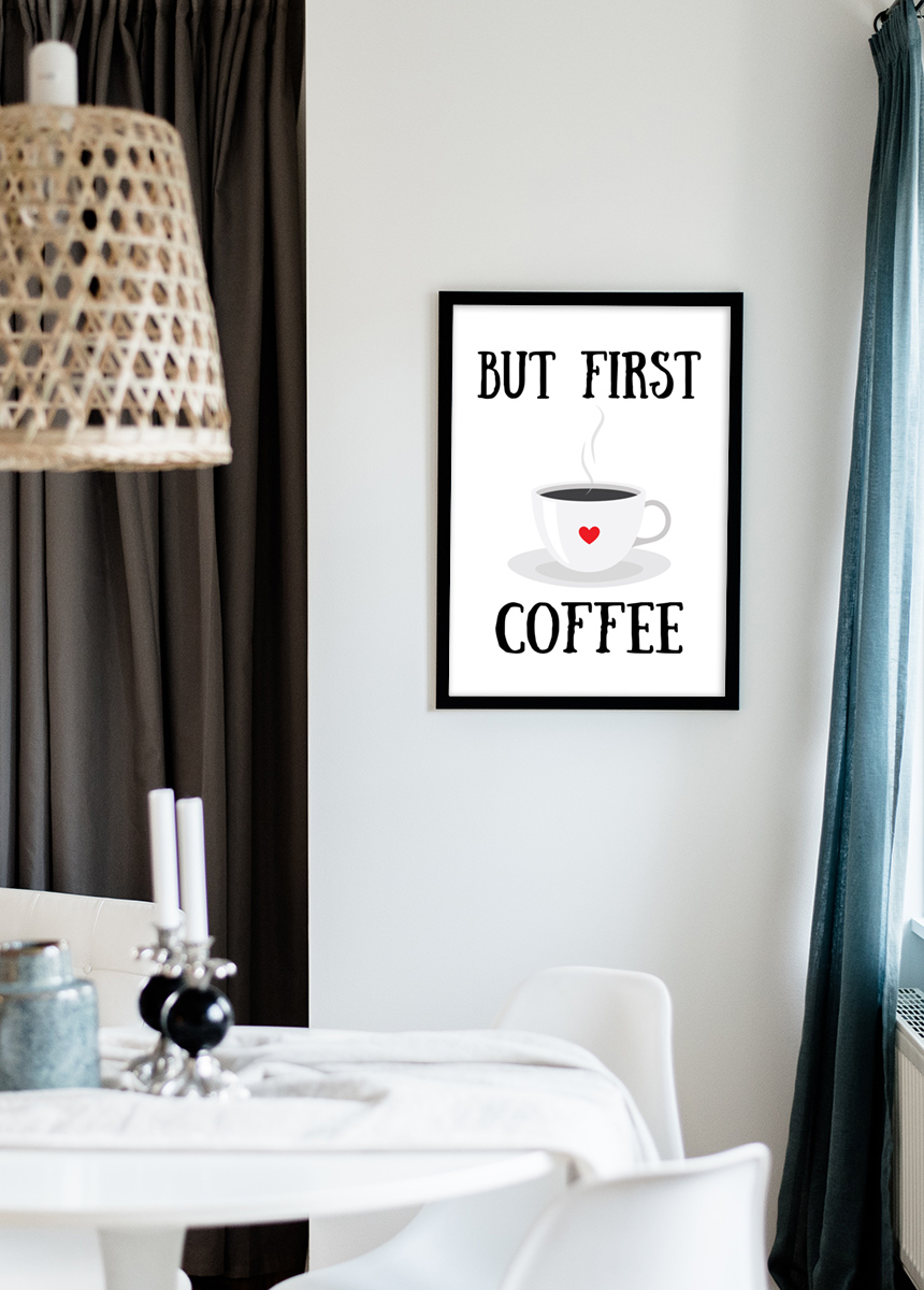 Αφίσα με μια εικονογράφηση μιας κούπας καφέ με ένα μήνυμα για το άτομο που αγαπά τον καφέ. Το γλυκό μοτίβο με μια καρδιά στην κούπα είναι ένα ωραίο δώρο για να δώσεις και ταιριάζει καλά να κρεμαστεί στην κουζίνα σε μια αγροτική ή ρετρό εμπνευσμένη διακόσμηση. Συμπληρώστε την αφίσα με μια κορνίζα που ταιριάζει στο ίδιο στυλ με την εικονογράφηση και τη διακόσμηση γενικότερα για να δημιουργήσετε μια αίσθηση ολοκλήρωσης στο σπίτι.