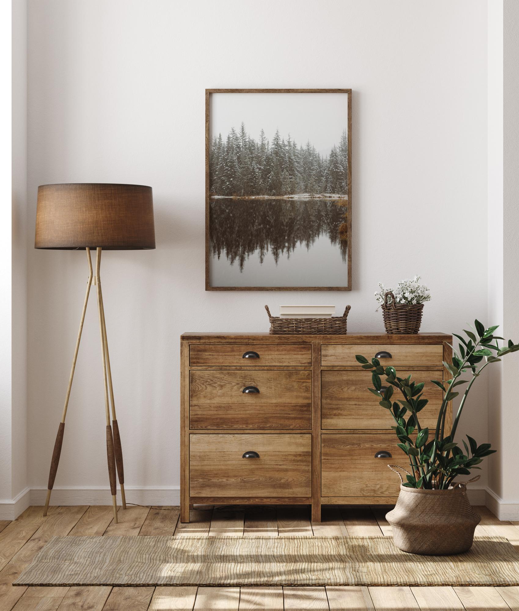 Μια αφίσα με έλατα καλυμμένα με χιόνι στην άκρη μιας λίμνης. Τα έλατα δημιουργούν τέλειες αντανακλάσεις στη λίμνη για να δημιουργήσουν μια ήρεμη, αλλά και ψυχρή, σκηνή. Φέρτε τον χειμώνα στο σπίτι σας με αυτήν την εξαιρετικά όμορφη φωτογραφία φύσης και χαρείτε που είστε ζεστοί εντός.