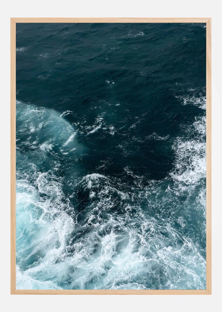 Μια αφίσα θάλασσας με κύματα που χτυπούν και στροβιλίζονται στην ανοιχτή θάλασσα. Λευκός αφρός στροβιλίζεται γύρω από το κάτω άκρο της εικόνας για να αποκτήσει έναν πιο ήρεμο τόνο σκούρου ακουαμαρίν. Φανταστείτε ότι βρίσκεστε σε μια βάρκα στα κύματα με τη βοήθεια αυτής της φανταστικής εικόνας.