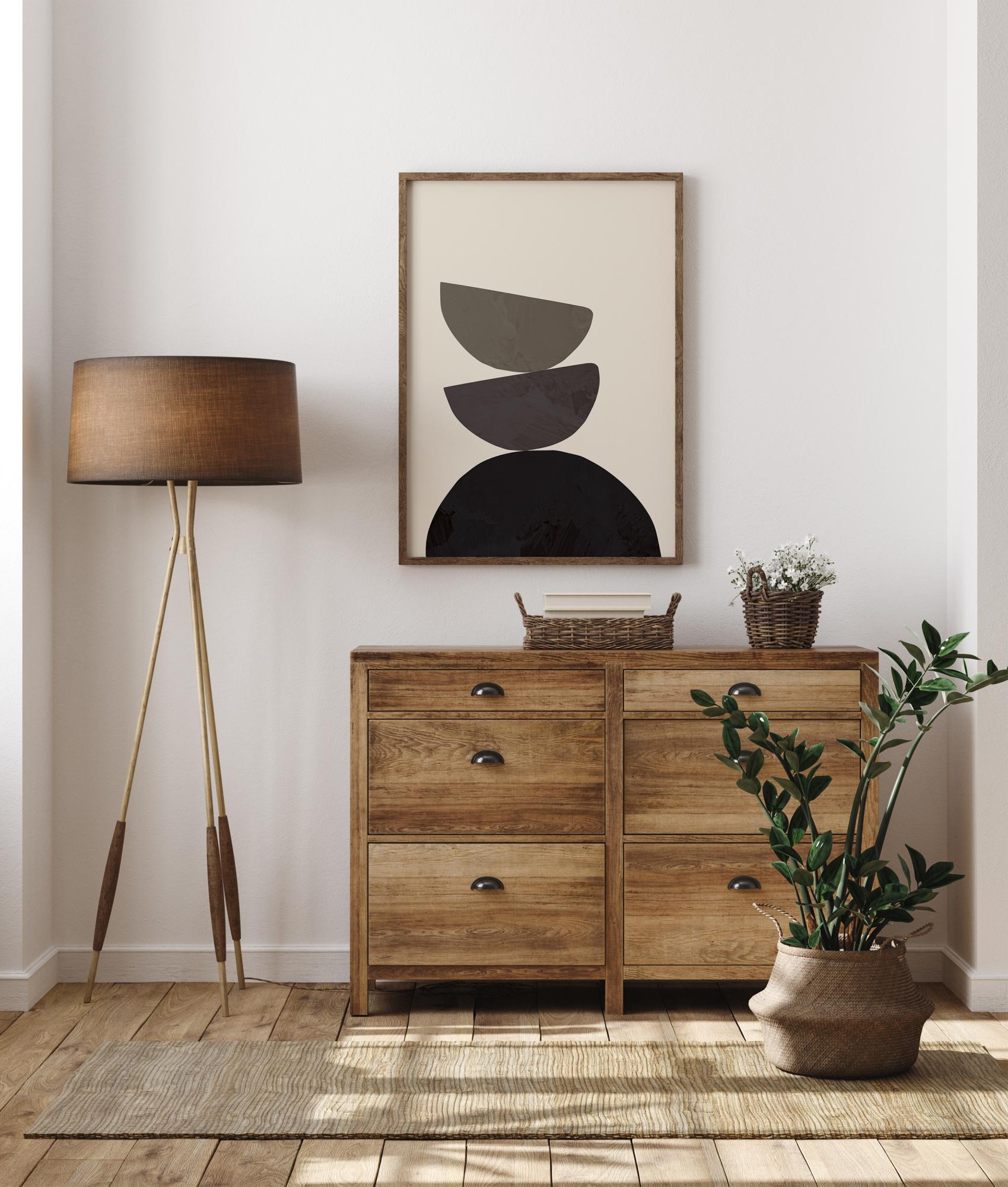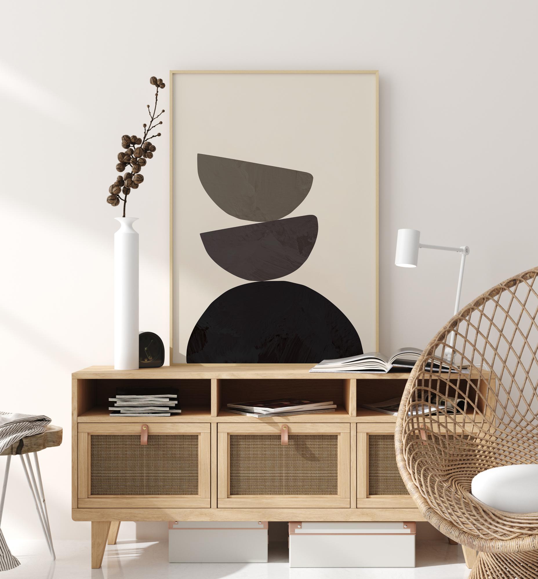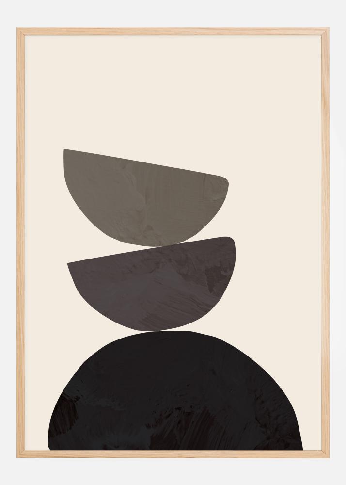 Μια αφίσα με τρεις στοιβαγμένες ημικυκλικές που ισορροπούν η μία πάνω στην άλλη. Στη βάση υπάρχει ένα μαύρο ημικύκλιο με δύο ημικύκλια που κοιτούν προς τα πάνω σε διαφορετικές γκρι αποχρώσεις. Απολαύστε τις απίστευτα ισορροπημένες μορφές όταν κρεμάτε αυτήν την εικόνα σε έναν ανοιχτόχρωμο τοίχο.