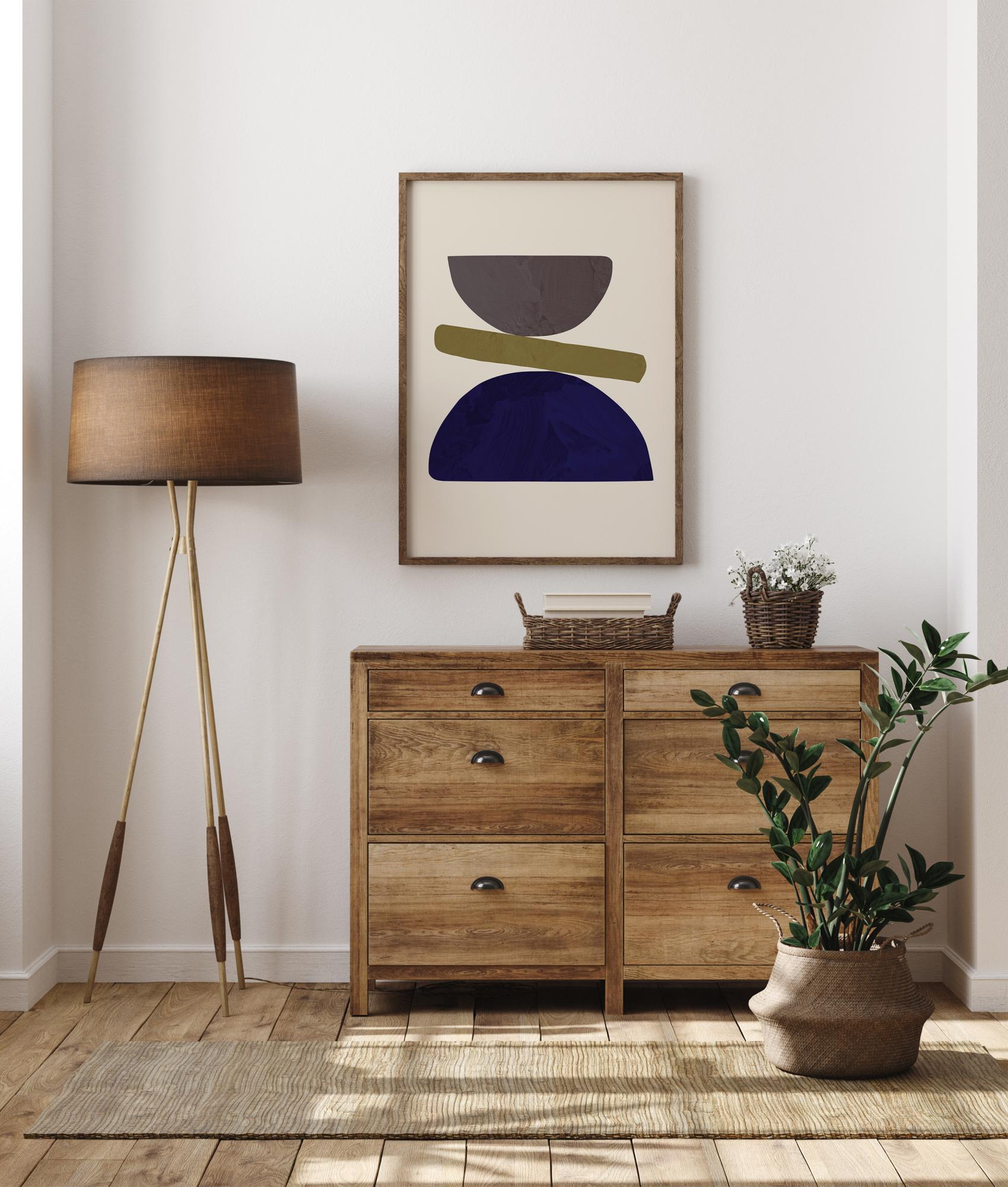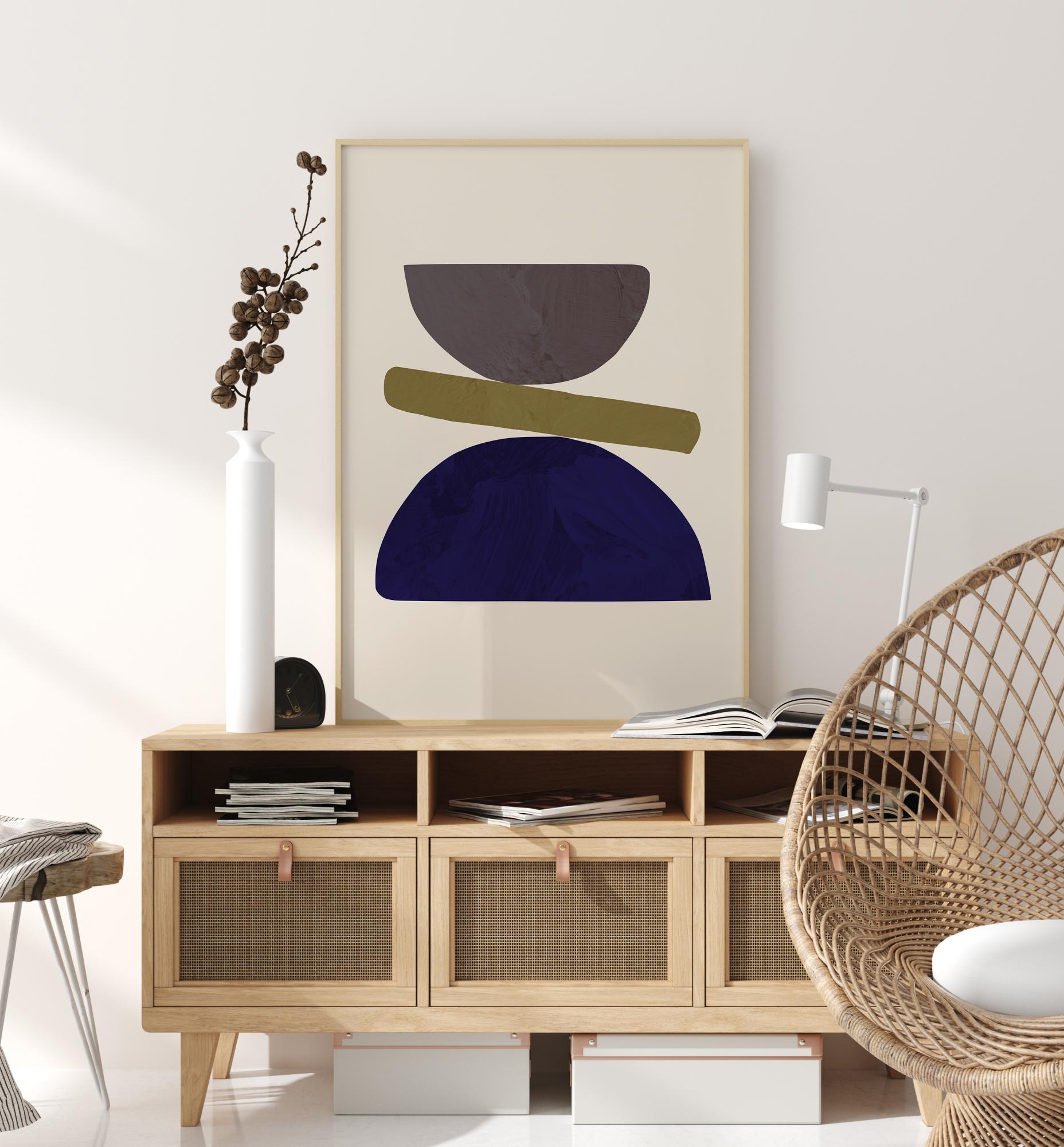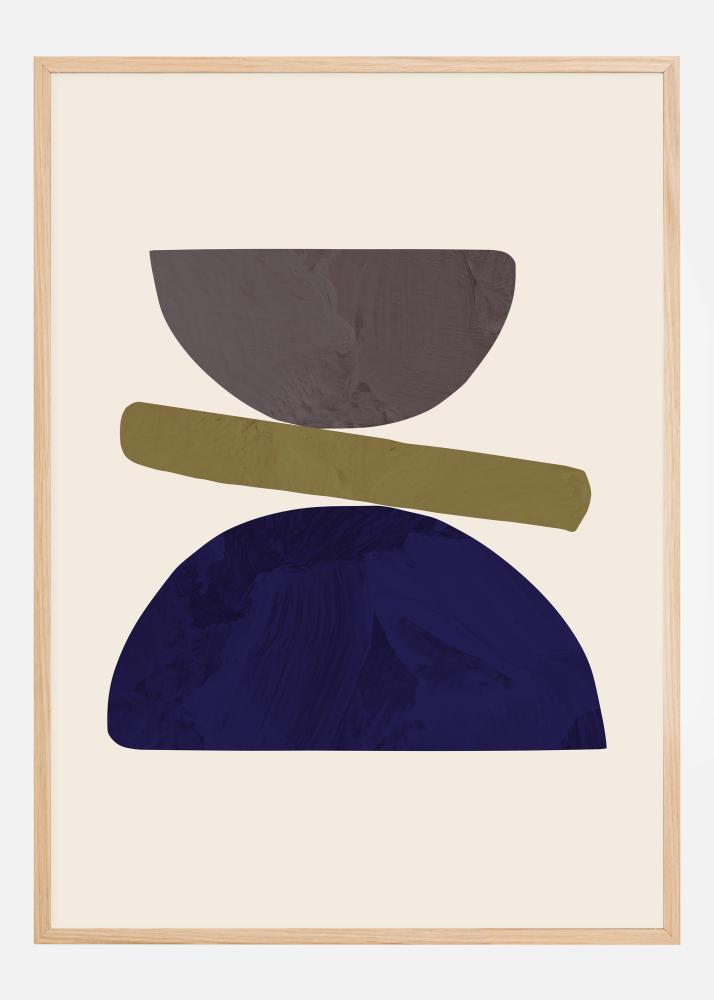 Μια αφίσα για ισορροπία μέσω της γεωμετρίας. Ένα μεγάλο μπλε ημικύκλιο ισορροπεί ένα λεπτό πράσινο επιμήκες σχήμα στην καμπυλωτή επιφάνειά του. Επιπλέον, γκρίζα ημικύκλια δημιουργούν ένα σχήμα κλεψύδρας. Περάστε ώρες μπροστά από αυτό το έργο και προσπαθήστε να βρείτε τα άλλα σχήματα σε αυτό.