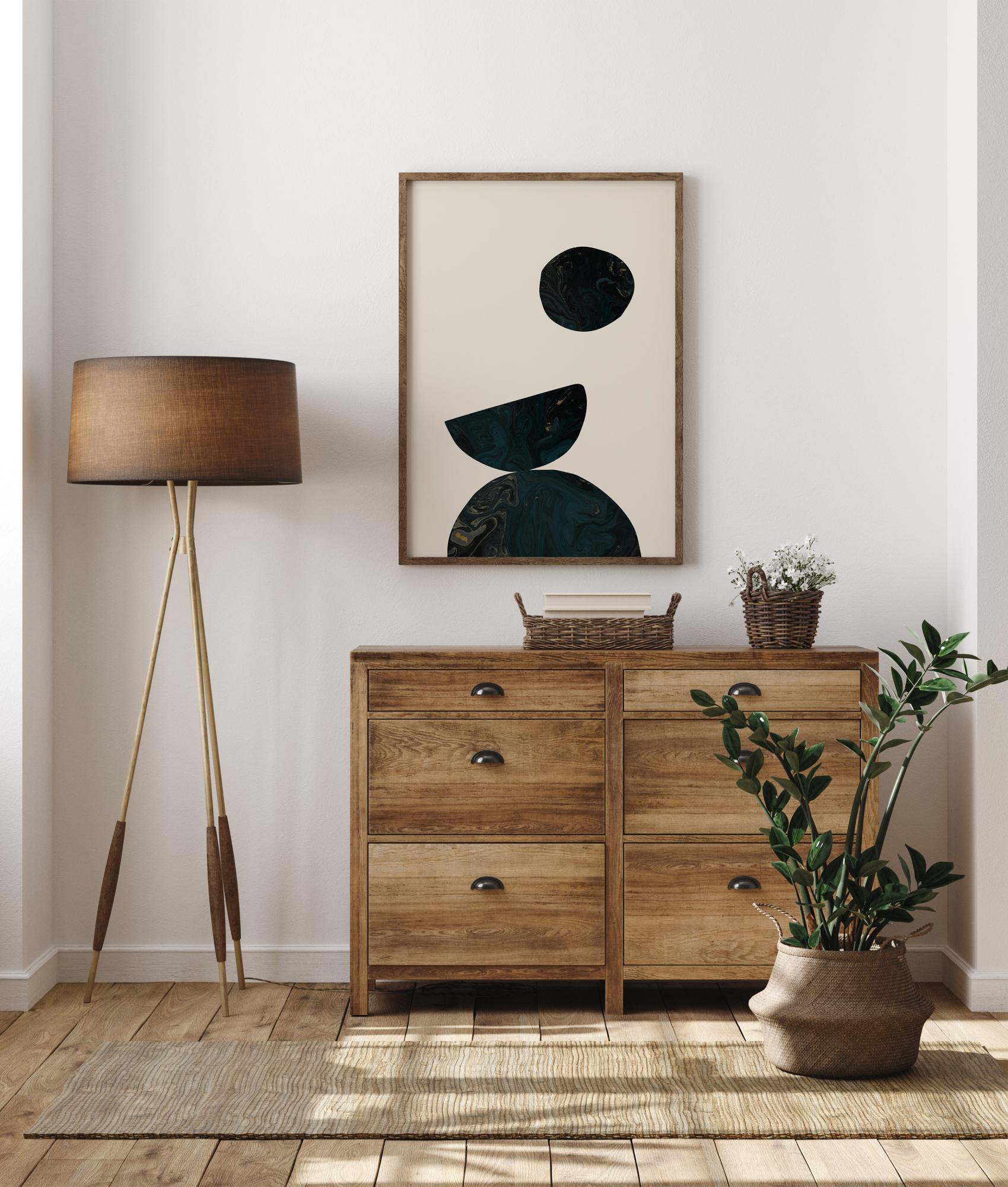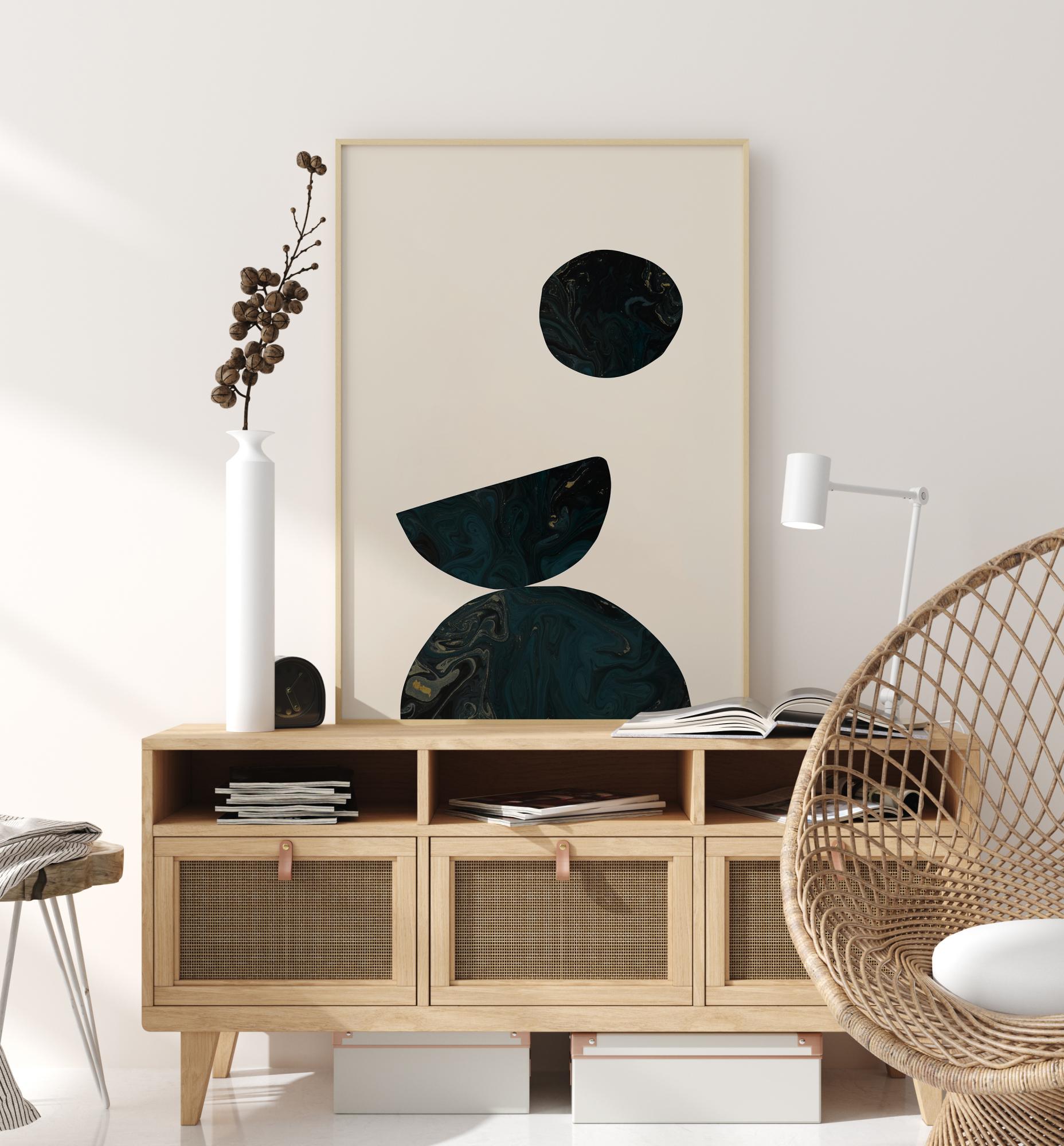 Μια φωτεινή αφίσα με τρεις σκουρόχρωμες μπλε και μαύρες φόρμες που δημιουργούν μια εντυπωσιακή εικόνα. Ένα ημικύκλιο είναι τοποθετημένο στο κάτω μέρος και ισορροπεί ένα άλλο ανεστραμμένο ημικύκλιο. Πάνω του αιωρείται ένας μαύρος κύκλος. Όλα βρίσκονται πάνω σε ένα αντιθετικό λευκό φόντο. Συνδυάστε τα όμορφα μαρμάρινα στροβιλισμένα σχέδια με έναν πιο απαλό τόνο στους τοίχους για επιπλέον δράμα.
