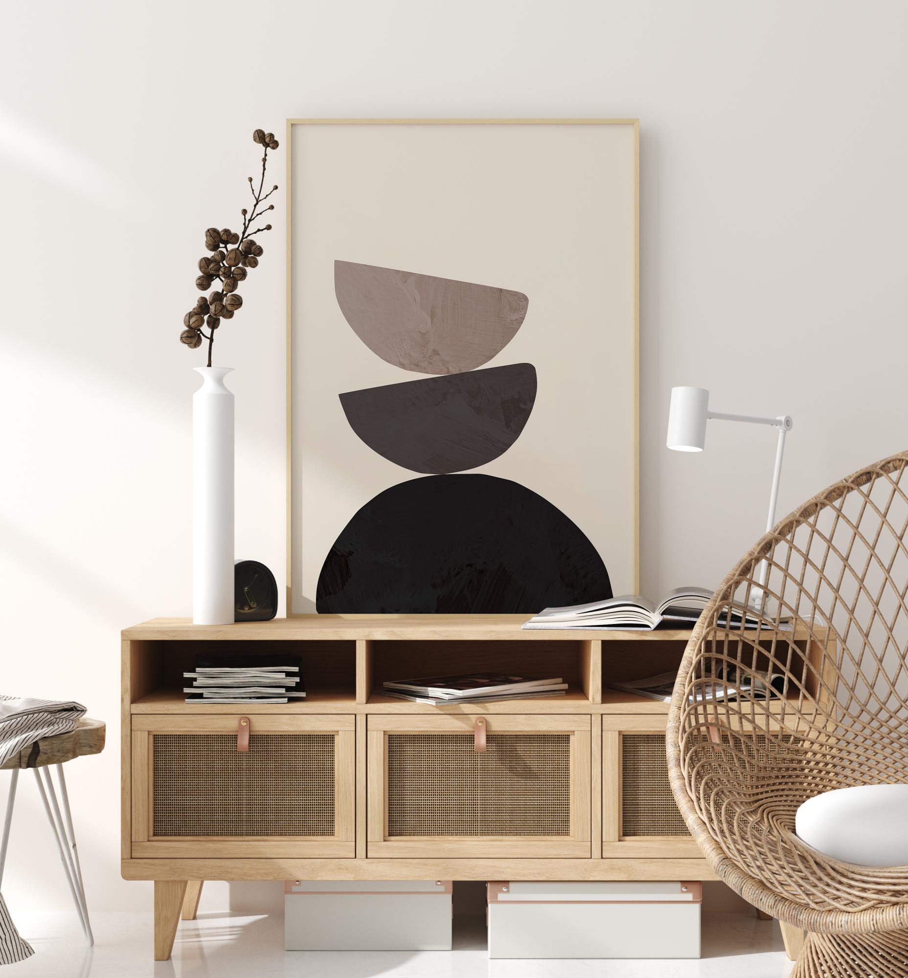 Μια απλή αφηρημένη αφίσα με τρία διαφορετικά ημικύκλια. Κάθε ημικύκλιο έχει μια ατομική απόχρωση του γκρι που αρχίζει με μαύρο στο κάτω μέρος και φτάνει σε ένα ανοιχτό γκρι στην κορυφή. Ισορροπούν το ένα πάνω στο άλλο, προσδίδοντας μια αίσθηση προσεκτικής σταθερότητας στο έργο.