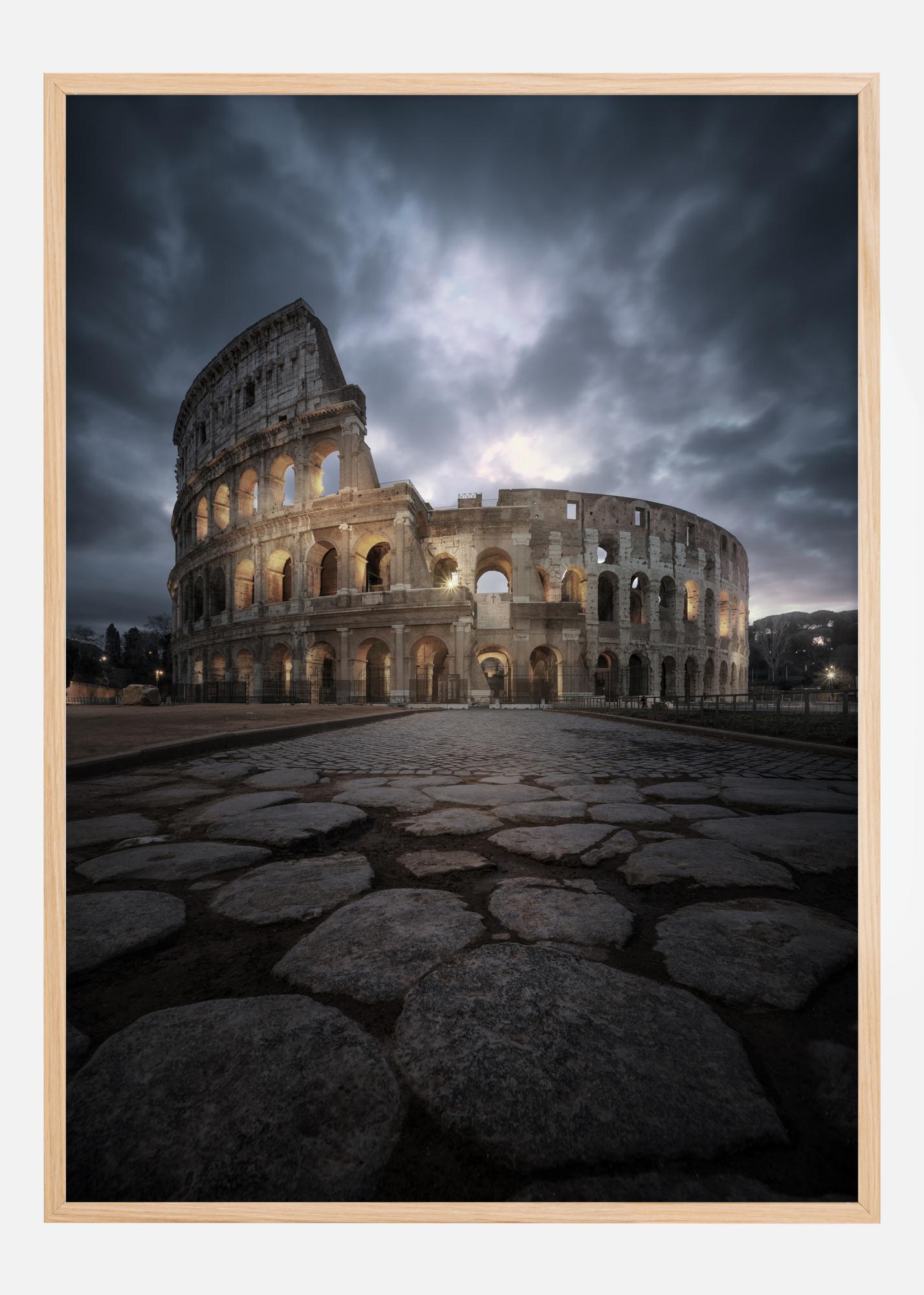 Αυτή η δραματική αφίσα συλλαμβάνει την ουσία των ιστορικών δονήσεων με μια εντυπωσιακή εικόνα του Κολοσσαίου στη Ρώμη κάτω από έναν έντονα νεφελώδη ουρανό. Οι βαθιές γκρι και μπλε αποχρώσεις του ουρανού αντιπαρατίθενται έντονα με τον ζεστό φωτισμό που τονίζει την υφή των αρχαίων λίθων. Αυτή η εκτύπωση προσφέρει μια ματιά στην αρχαία αρχιτεκτονική και τον σχεδιασμό, που κάνει τον χρόνο να σταματά μέσω της διαχρονικής της ομορφιάς.