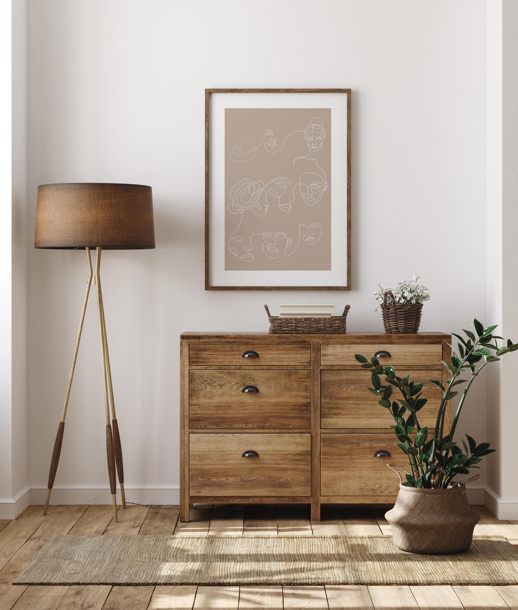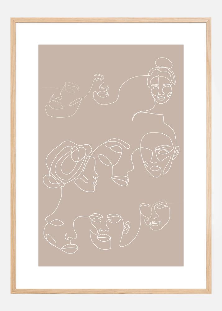 Μια αφίσα σκίτσου με έναν αριθμό διαφορετικών αφηρημένων κεφαλιών και προσώπων. Αυτά τα αφηρημένα κεφάλια έχουν όλα σχεδιαστεί με μία μόνο γραμμή και είναι συνδεδεμένα σε μια μακριά σειρά. Οι λευκές γραμμές στο μπεζ φόντο θα λειτουργούσαν καλά μαζί με έναν έντονα χρωματισμένο τοίχο για μια επιπλέον καλλιτεχνική ατμόσφαιρα.