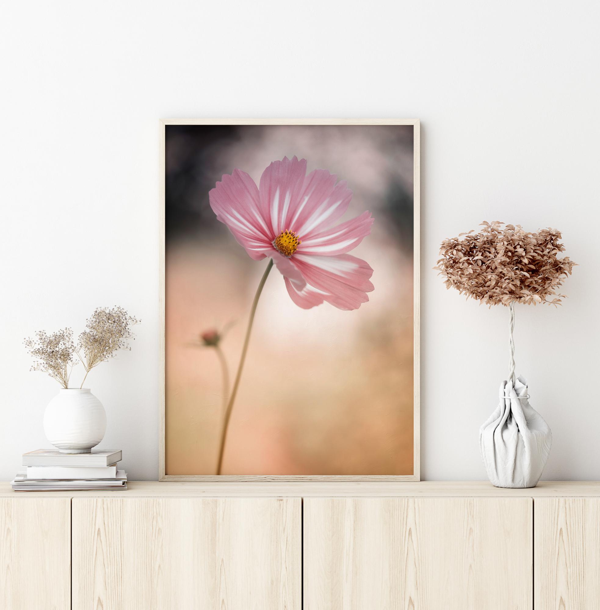 Μια φανταστική αφίσα με ένα κοσμάμη με το φως που λάμπει μέσα από το πέταλο. Το ροζ του πετάλου και το κίτρινο κέντρο είναι φωτεινά με ένα ροδακινί φόντο που δίνει βάθος. Νιώστε φως και αύρα όταν κοιτάτε αυτή την απαλή εικόνα σε παστέλ να κρέμεται στο σπίτι σας.