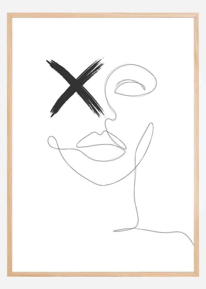 Μια αφηρημένη αφίσα με ένα πρόσωπο σχεδιασμένο με μια λεπτή μαύρη γραμμή σε λευκό φόντο. Η γραμμή είναι ενωμένη σε μια ρευστή κίνηση για να σχηματίσει το πρόσωπο. Πάνω από ένα μάτι είναι σχεδιασμένος ένας μεγάλος μαύρος σταυρός. Κρεμάστε το σε έναν τοίχο με έντονα χρώματα για ένα ενδιαφέρον θέμα συζήτησης.