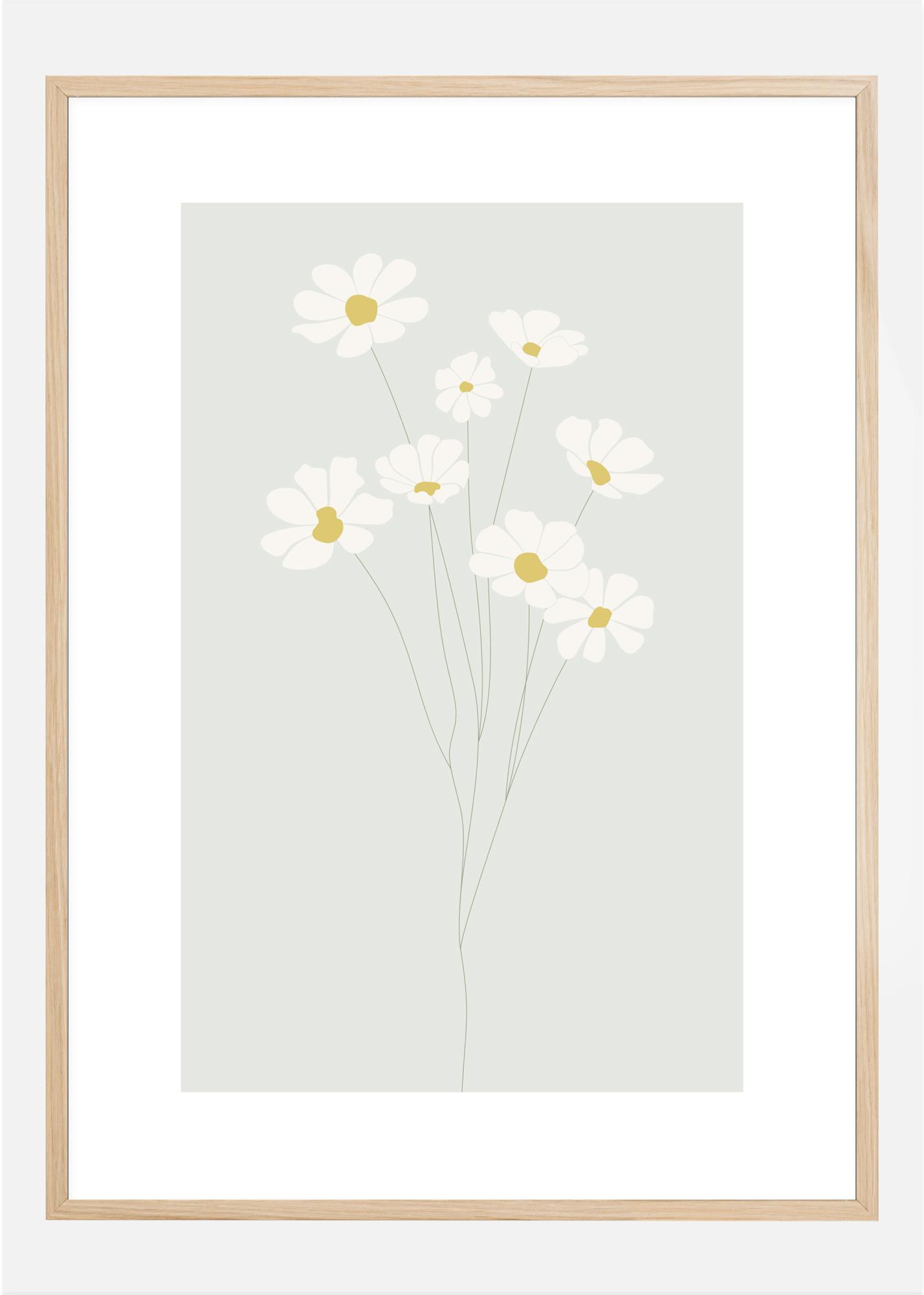Μια διακριτική αφίσα με εκτύπωση μιας μαργαρίτας με ένα εύθραυστο βλέμμα. Τα απλά λευκά και κίτρινα λουλούδια εκτείνονται προς τα πάνω σε λεπτά στελέχη προς ένα μαλακό ξεθωριασμένο μπλε φόντο. Κρεμάστε αυτήν την εικόνα στο υπνοδωμάτιο του παιδιού σας για μια ήρεμη, αλλά γλυκιά ατμόσφαιρα.
