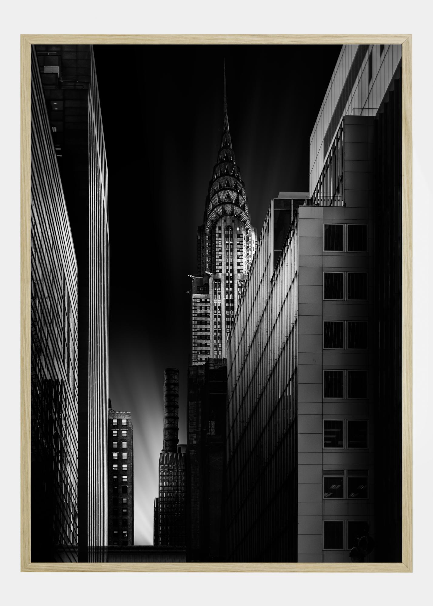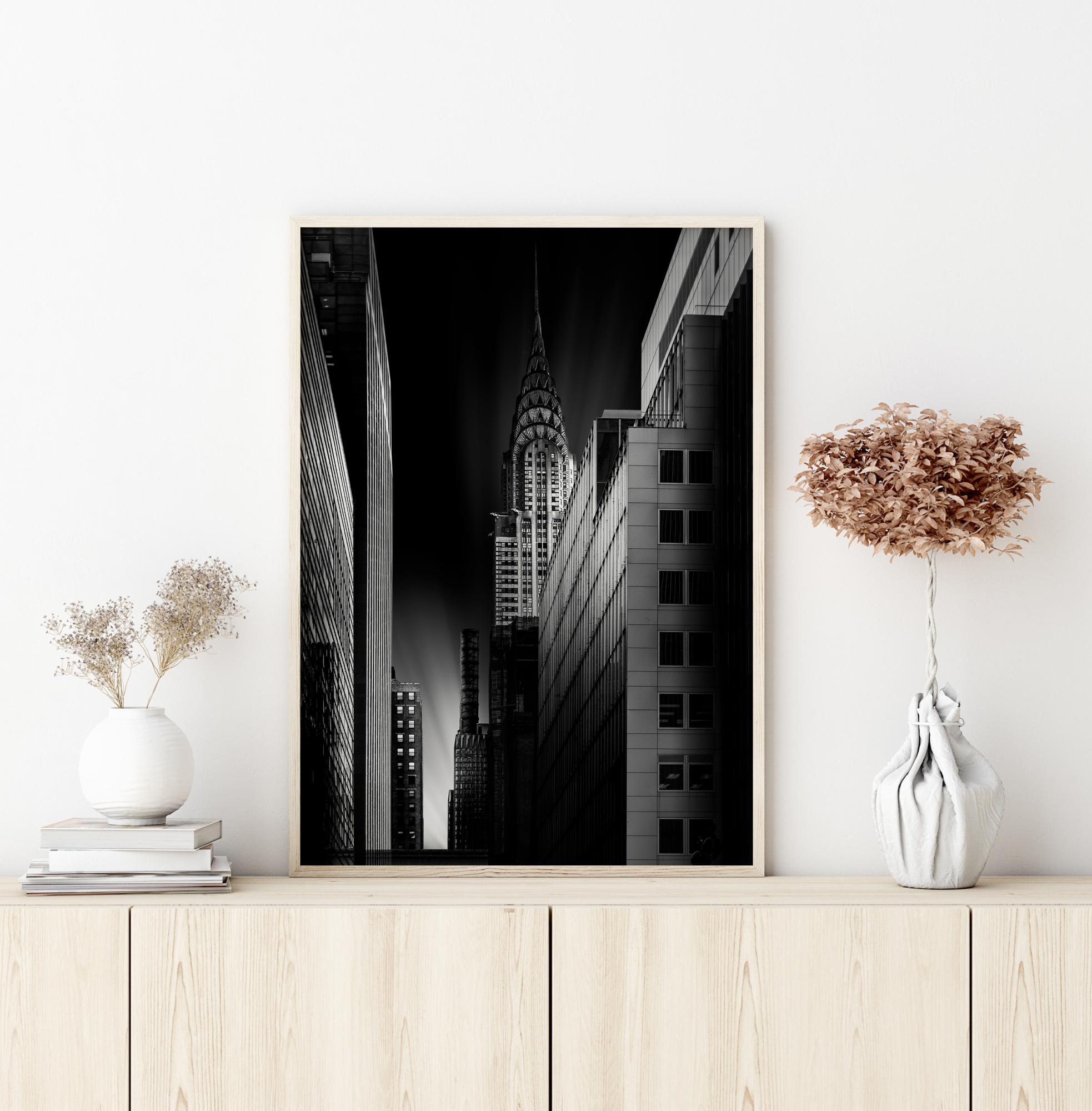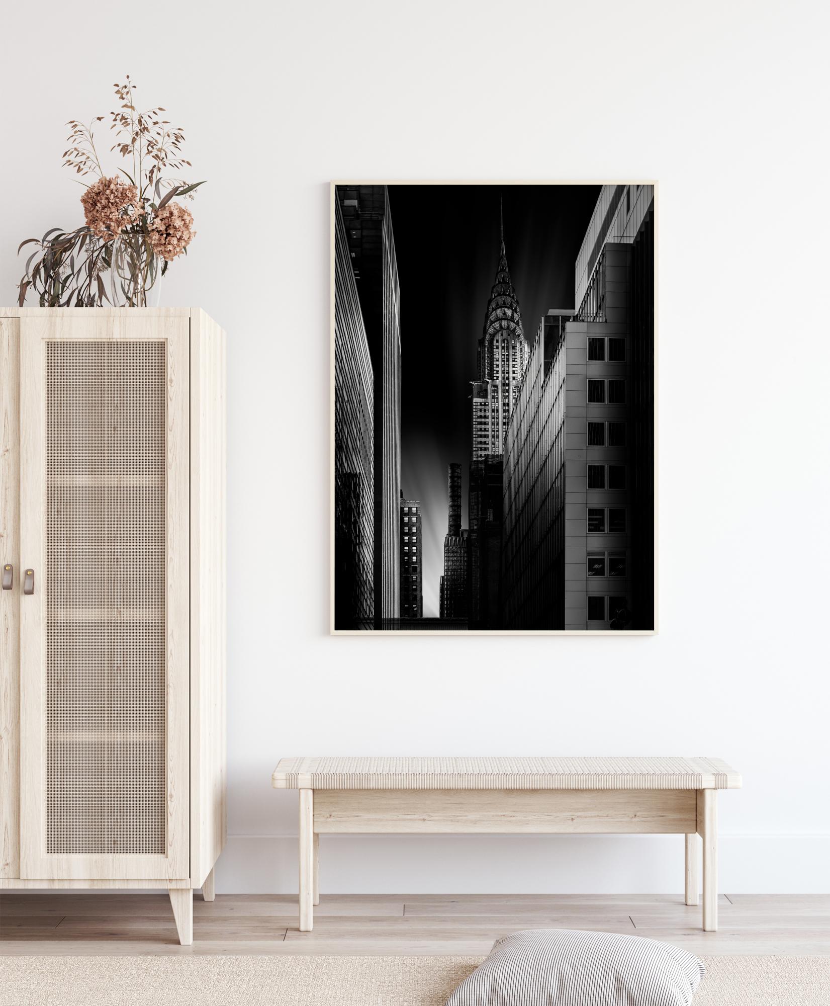 Μια αστική αφίσα με το κτίριο Chrysler τη νύχτα. Ένας στενός δρόμος οδηγεί το βλέμμα σε μια λάμψη φωτός στον ουρανό. Στα δεξιά μπορεί να φανεί το σκιερό κτίριο σε αυτήν την κάπως ανατριχιαστική φωτογραφία. Κρεμασμένη στον τοίχο μιας λευκής γκαλερί.