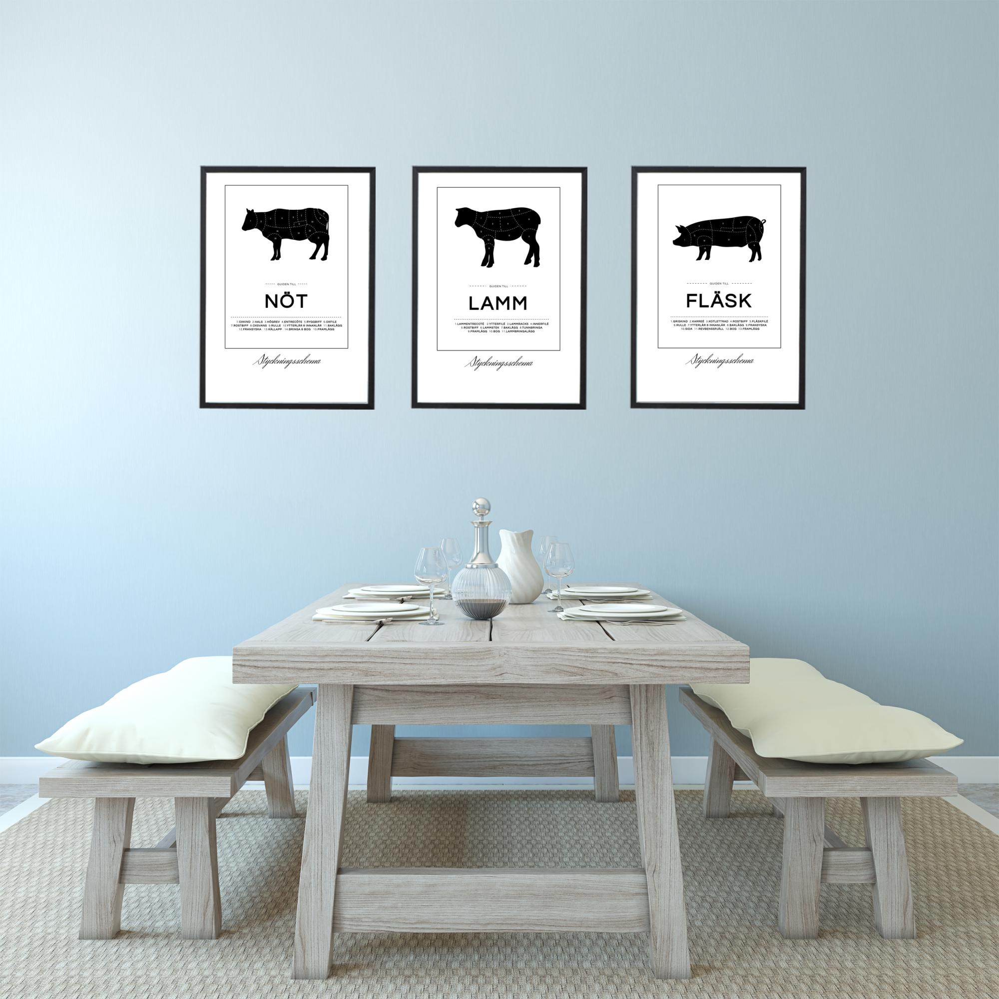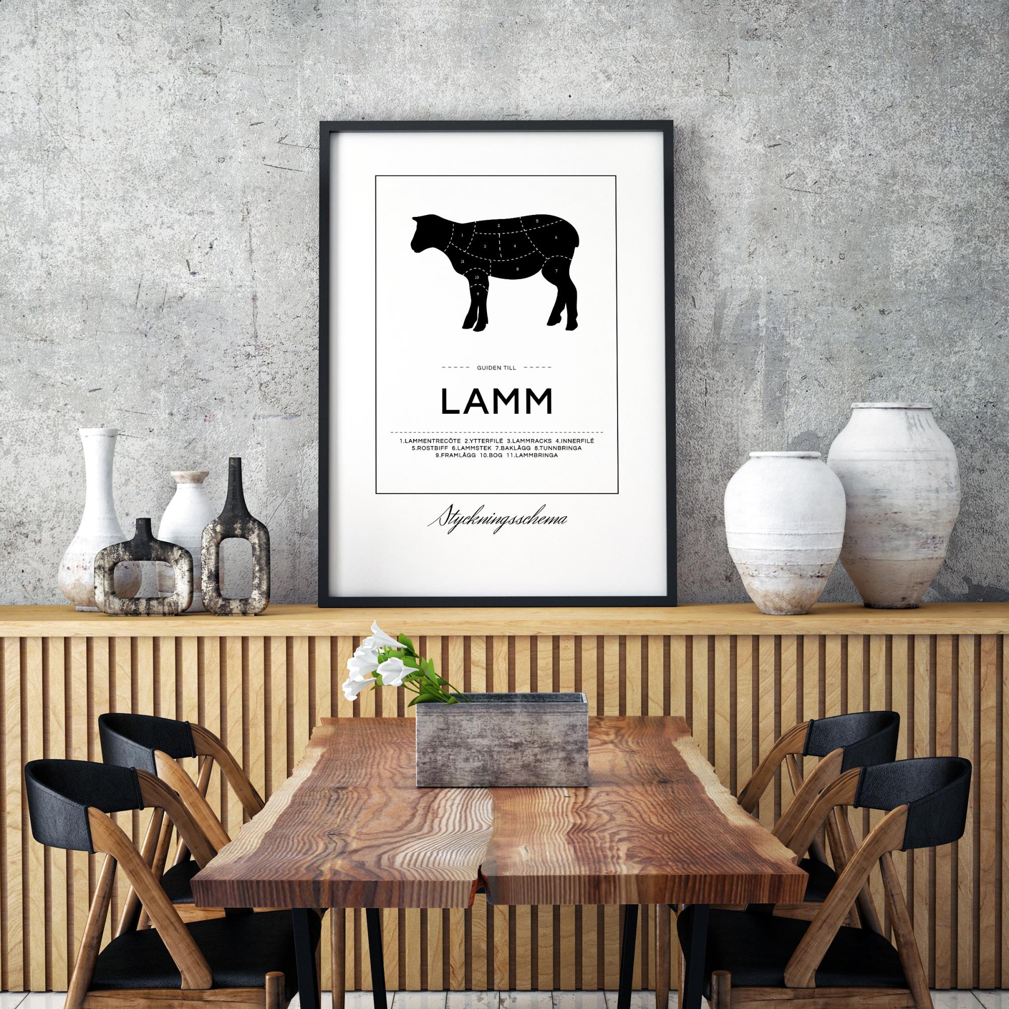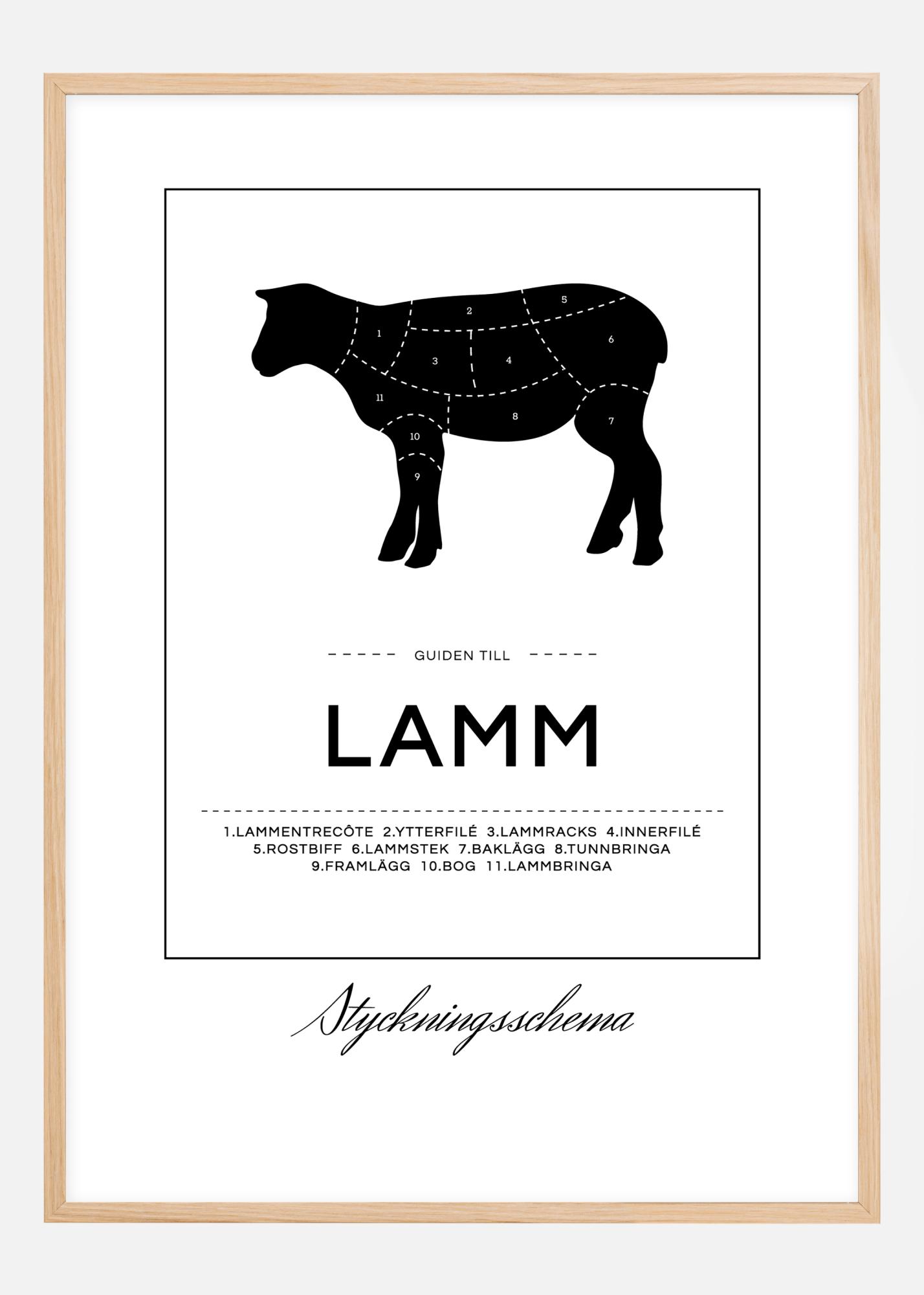 Μάθε πού να βρεις όλες τις λιχουδιές από αρνί με αυτή την κομψή αφίσα στον τοίχο. Η αφίσα απεικονίζει ένα μαύρο αρνί που είναι χωρισμένο σε σημάνσεις που δείχνουν πού, για παράδειγμα, βρίσκονται το εξωτερικό φιλέτο, τα παϊδάκια και ο ώμος. Συμπληρωματικά στην εικόνα υπάρχει το κείμενο "Οδηγός για αρνί" μαζί με μια τακτοποιημένη αριθμητική λίστα των διαφόρων μερών. Γύρω από το κείμενο και την εικόνα τρέχει ένα λεπτό ορθογώνιο και κάτω από το ορθογώνιο υπάρχει ένα εκτύπωμα με το κείμενο "Σχέδιο κοπής".