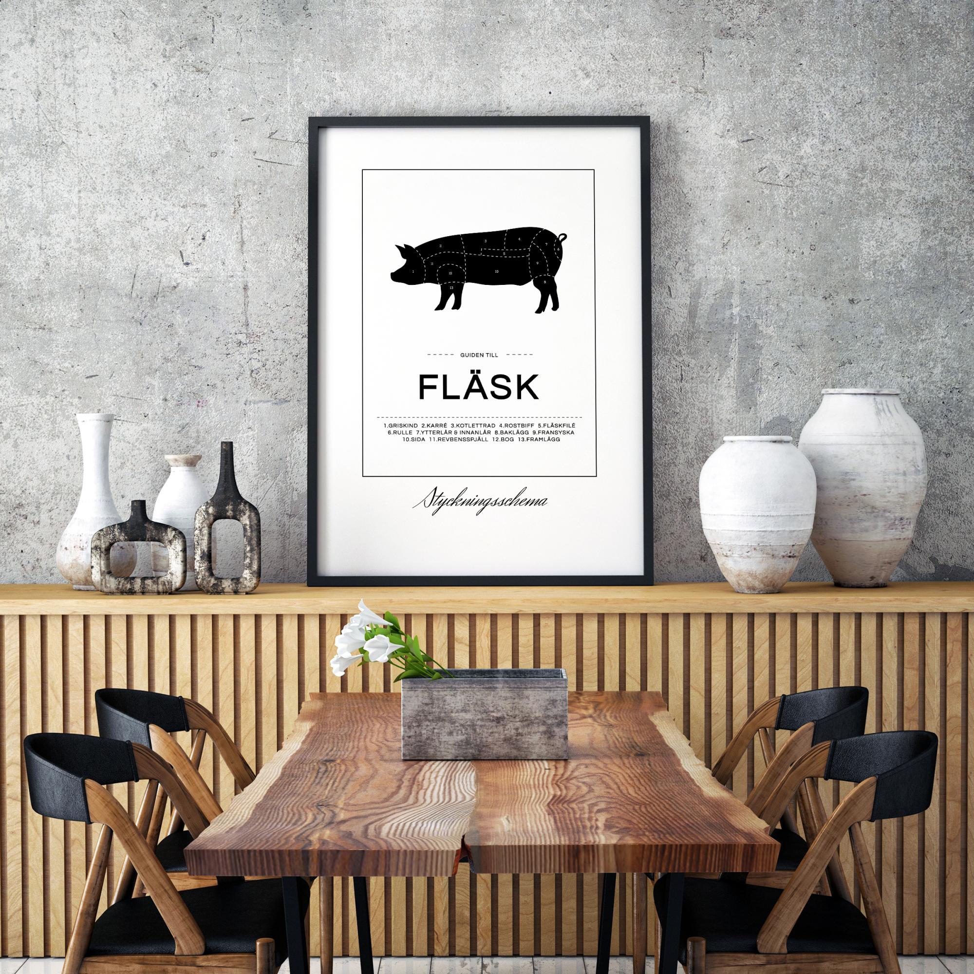 Δεν είναι μόνο οι χασάπηδες που μπορούν να τοποθετήσουν ένα κομψό διάγραμμα κρεοπωλείου στον τοίχο. Εδώ έχουμε μια ασπρόμαυρη αφίσα με εκτύπωση που απεικονίζει ένα γουρούνι με σημάδια που δείχνουν πού μπορείτε να βρείτε διάφορες χοιρινές λιχουδιές. Κάτω από το γουρούνι υπάρχει το κείμενο "Οδηγός στο Χοιρινό" τυπωμένο μαζί με μια τακτοποιημένη λίστα από μέρη του γουρουνιού. Τα κειμενικά κομμάτια διαχωρίζονται με δύο γραμμές διακεκομμένες και το μοτίβο πλαισιώνεται από ένα απλό τετράγωνο. Κάτω από το τετράγωνο είναι γραμμένο το κείμενο "Διάγραμμα Κρεοπωλείου" με ένα περίτεχνο στυλ γραμματοσειράς.