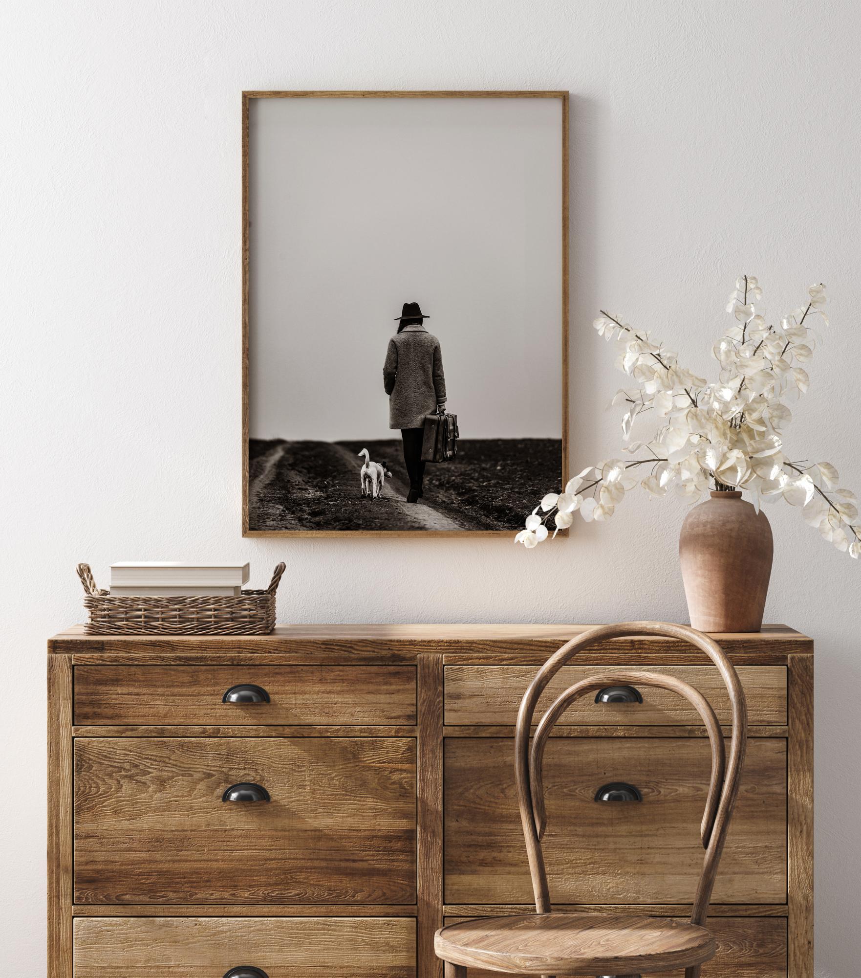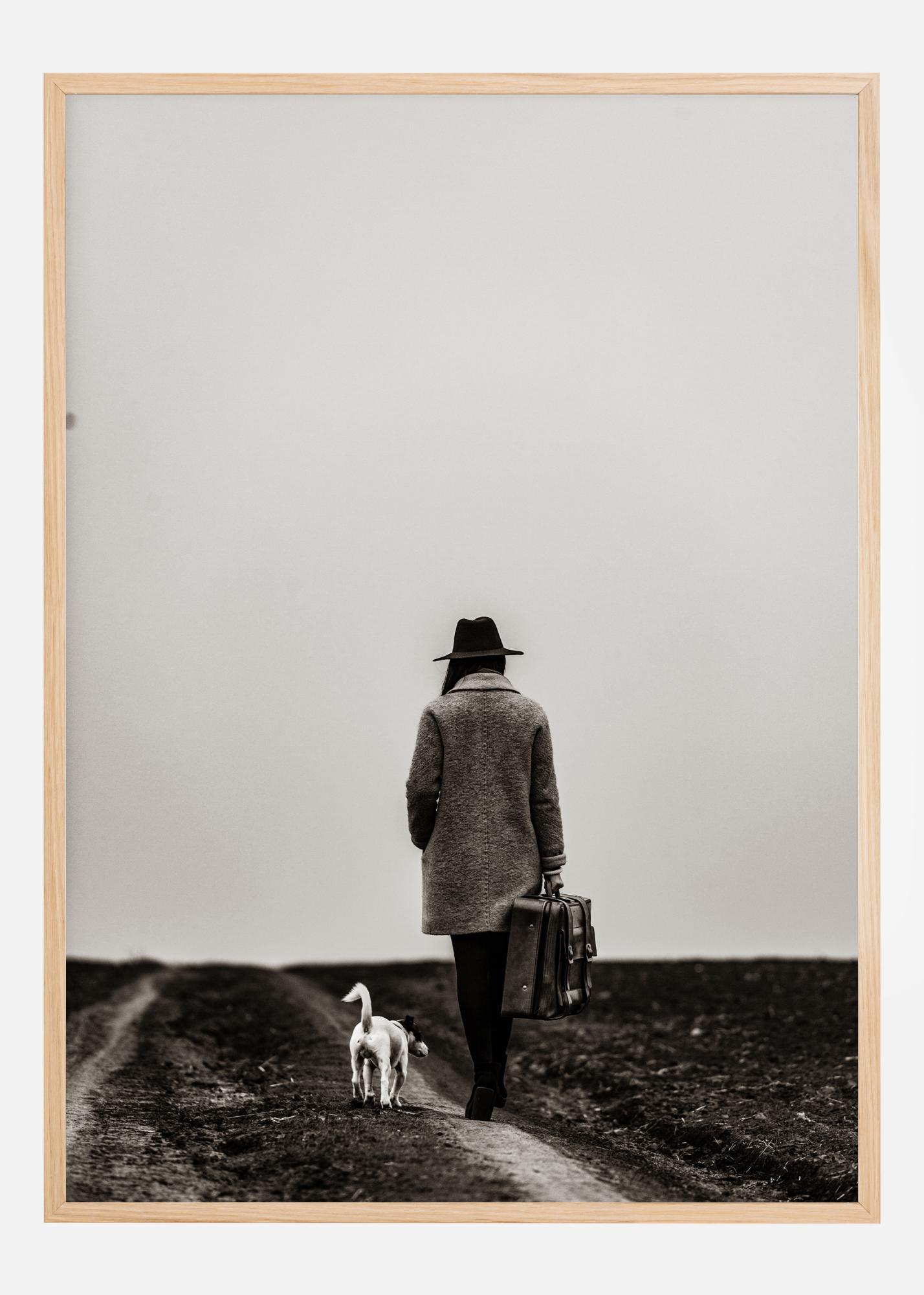Μια μινιμαλιστική αφίσα μιας γυναίκας που περπατά κατά μήκος ενός δρόμου με τον σκύλο της. Οι δύο λωρίδες οδηγούν στο βάθος, η γυναίκα που φοράει ένα μακρύ παλτό καθώς και μια βαλίτσα και το τεριέ της περπατά δίπλα της. Ο ευρύς φωτεινός ουρανός είναι ελκυστικός. Ακολουθήστε αυτή τη γυναίκα στα ταξίδια της καθώς αυτή η ασπρόμαυρη εικόνα κρέμεται στον τοίχο σας.