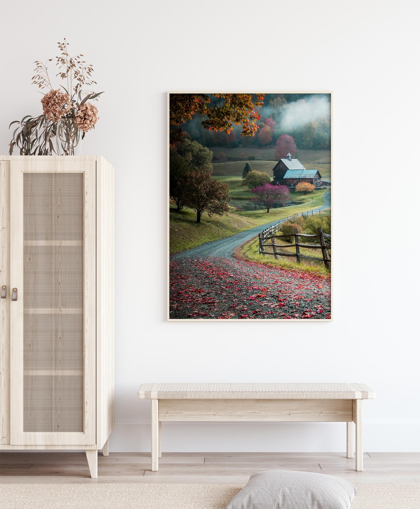 Μια αφίσα φυσικής με μια ύπαιθρο με ένα μικρό δρόμο, ένα ειδυλλιακό αγρόκτημα και φθινοπωρινά δέντρα. Κόκκινα φύλλα βρίσκονται στο δρόμο που οδηγεί σε μια κοιλάδα και το μικρό σπίτι. Μια ηλιαχτίδα διαπερνά την κοιλάδα και φωτίζει τα φθινοπωρινά φύλλα στο δέντρο. Νιώστε τη γοητεία της υπαίθρου όταν κρεμάτε αυτήν την εικόνα στο σπίτι σας.