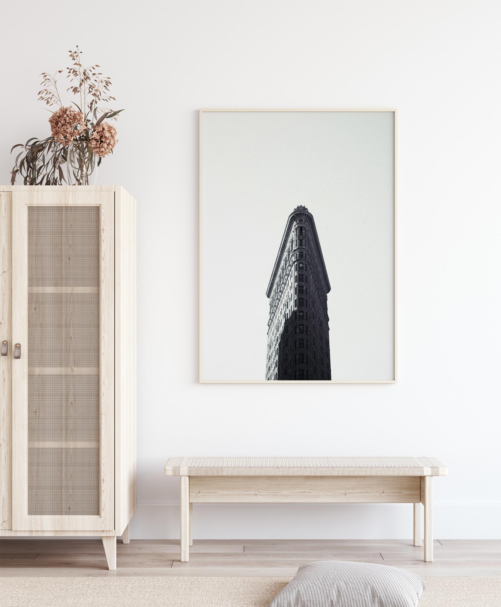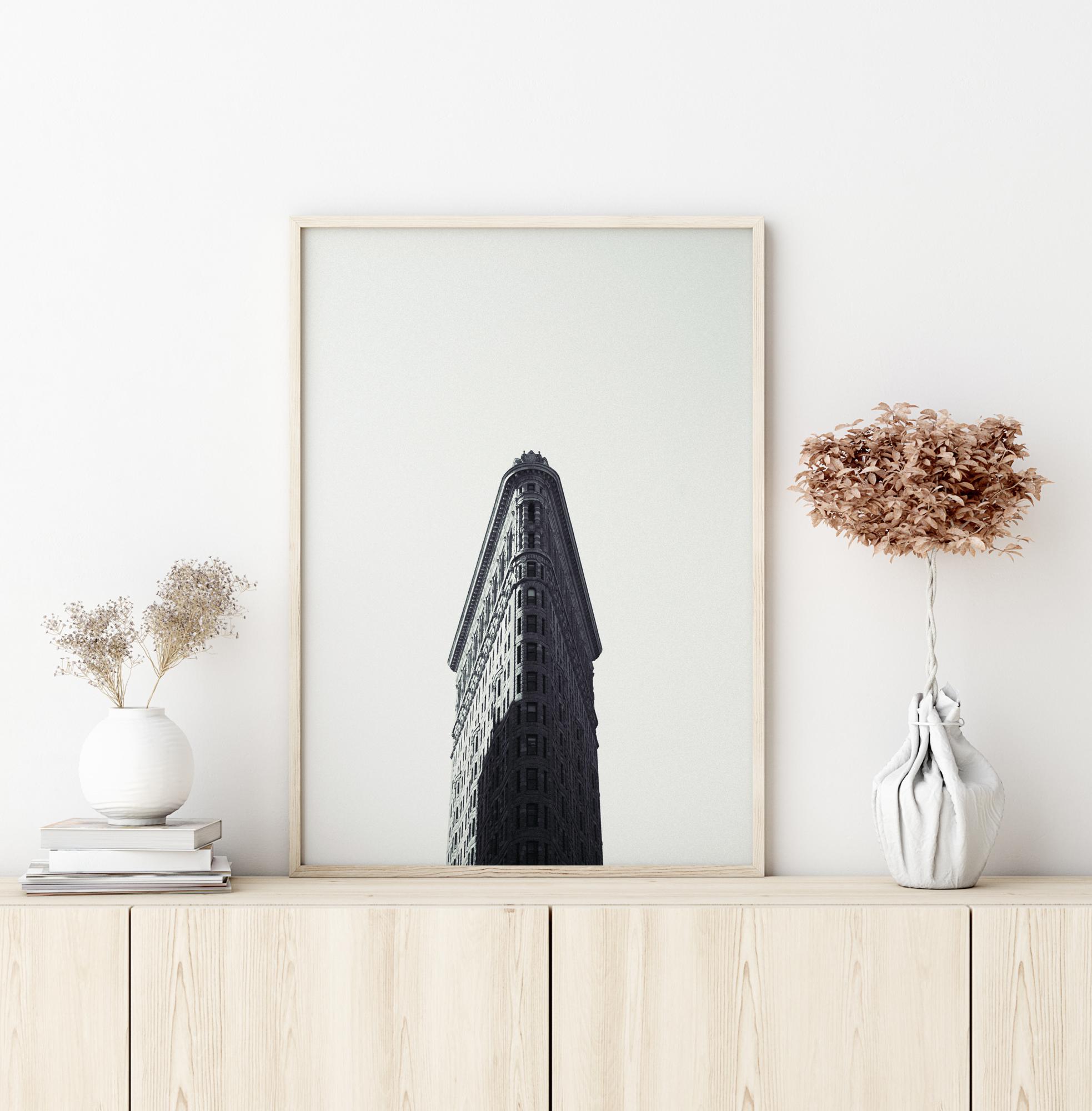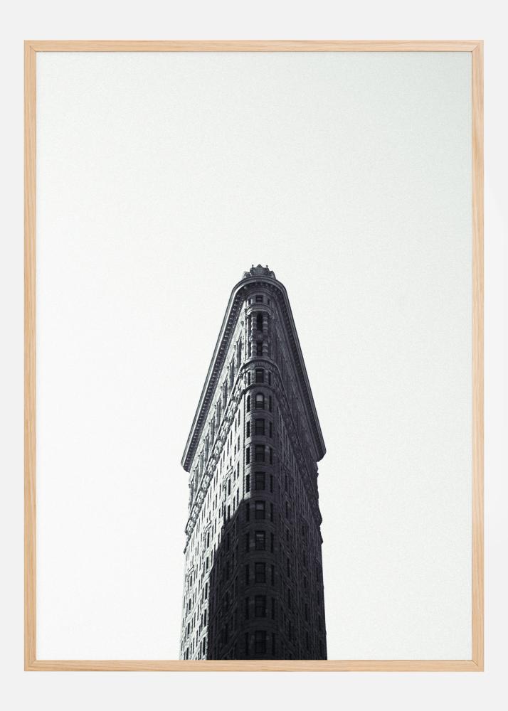 Μια αφίσα αρχιτεκτονικής που δείχνει την μπροστινή γωνία ενός παλιού συγκροτήματος διαμερισμάτων. Η πρόσοψη του κτιρίου μοιάζει με την πλώρη ενός πλοίου που στέκεται σε έντονη αντίθεση με τον λευκό ουρανό. Το τριγωνικό σχήμα τραβάει το βλέμμα και το οδηγεί προς την κορυφή του κτιρίου. Κρεμάστε αυτό το έργο σε έναν τοίχο με έντονο χρώμα για να δημιουργήσετε μια καλλιτεχνική ατμόσφαιρα.