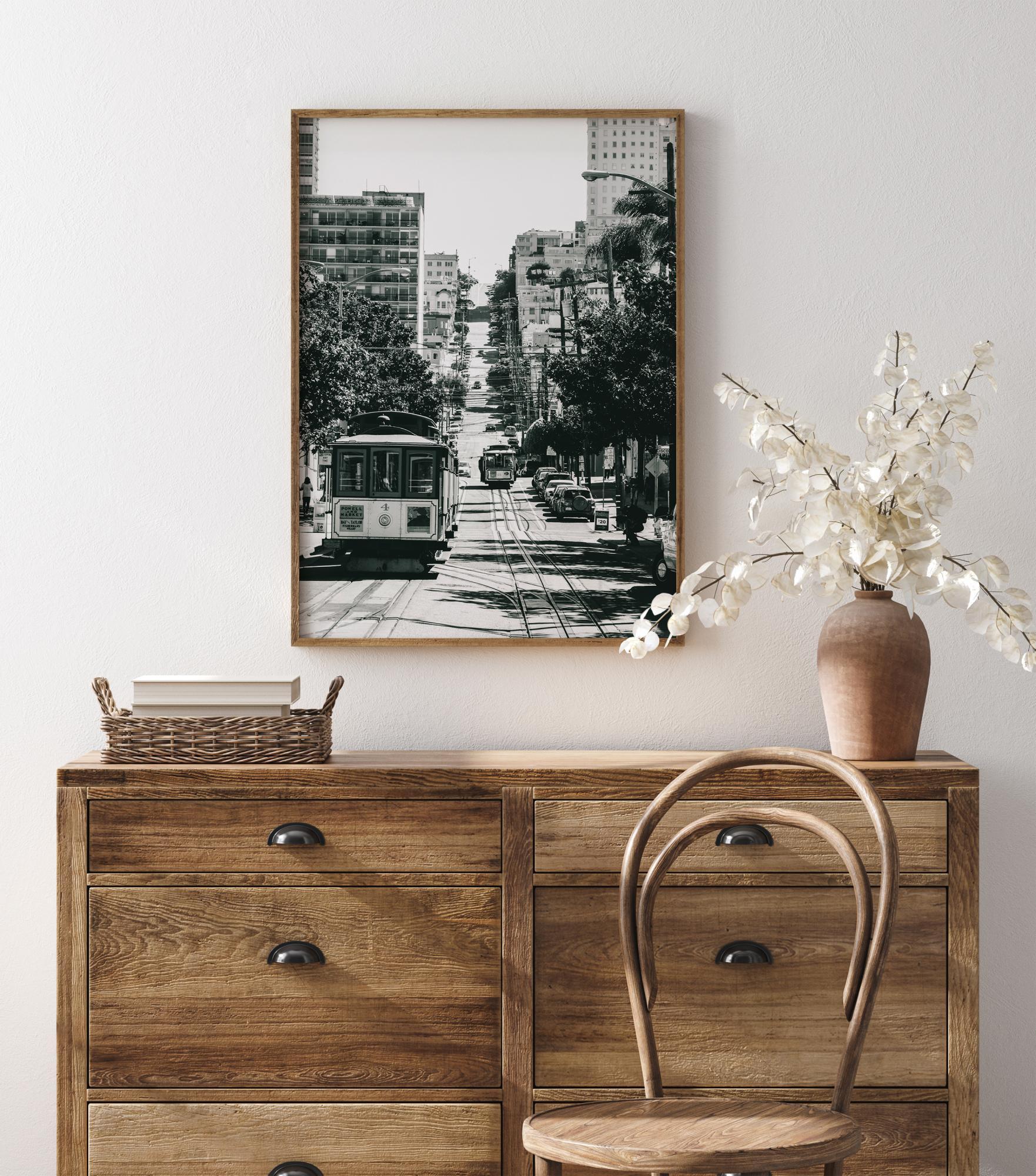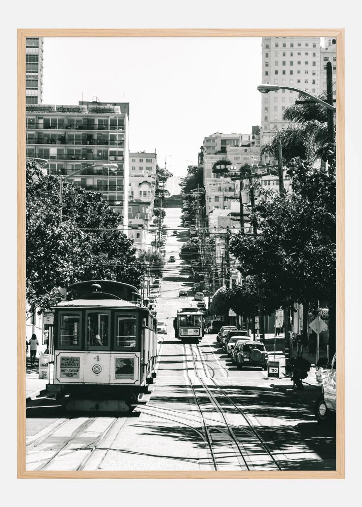 Μια αφίσα του τοπίου πόλης με το κέντρο της πόλης του Σαν Φρανσίσκο. Ένα τραμ ανεβαίνει ένα λόφο ανάμεσα στα σπίτια στο προσκήνιο με δέντρα σε κάθε πλευρά. Αυτή η ασπρόμαυρη εκτύπωση προσθέτει μια πινελιά κλάσης ανεξάρτητα από τον τοίχο που θα επιλέξετε να την κρεμάσετε.