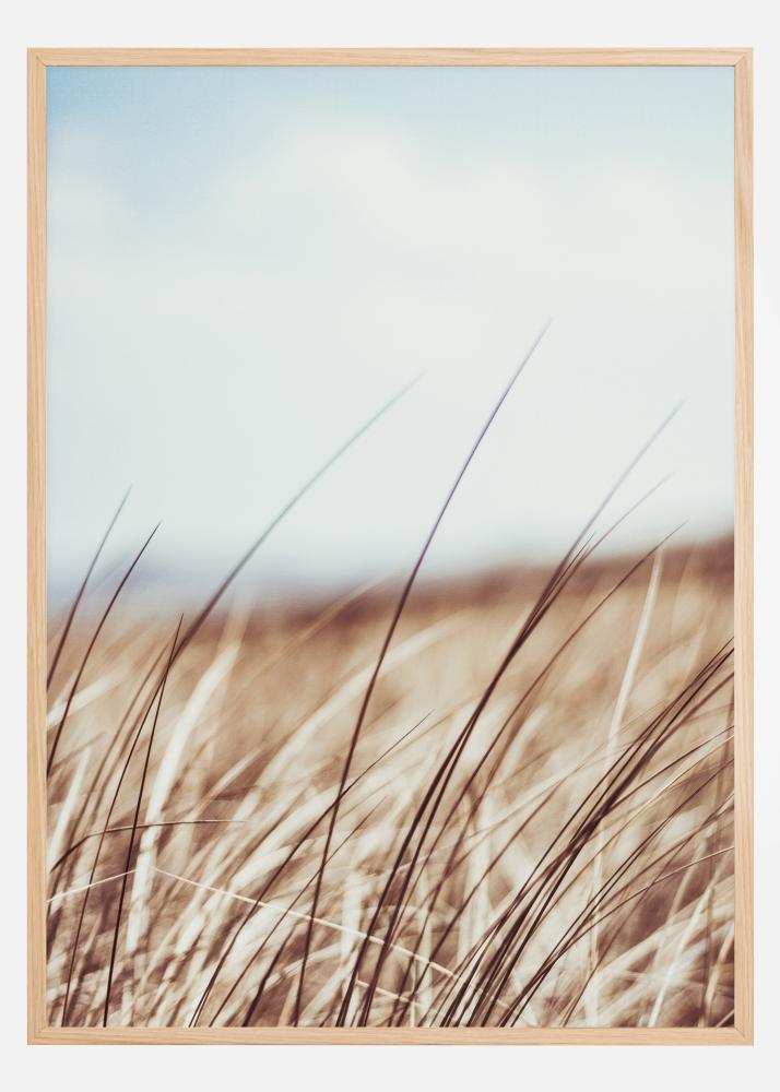Μια απλή αφίσα με γρασίδι που φυσάει στον άνεμο κάτω από έναν συννεφιασμένο μπλε ουρανό. Οι απαλές καφέ και κίτρινες αποχρώσεις των γρασιδιών και τα μακριά στελέχη, κατευθύνουν το βλέμμα προς τα επάνω και μέσα στα σύννεφα. Ονειρευτείτε μακριά με τη βοήθεια αυτού του καταπραϋντικού αγρού με το μακρύ γρασίδι κρεμασμένο στον τοίχο σας.