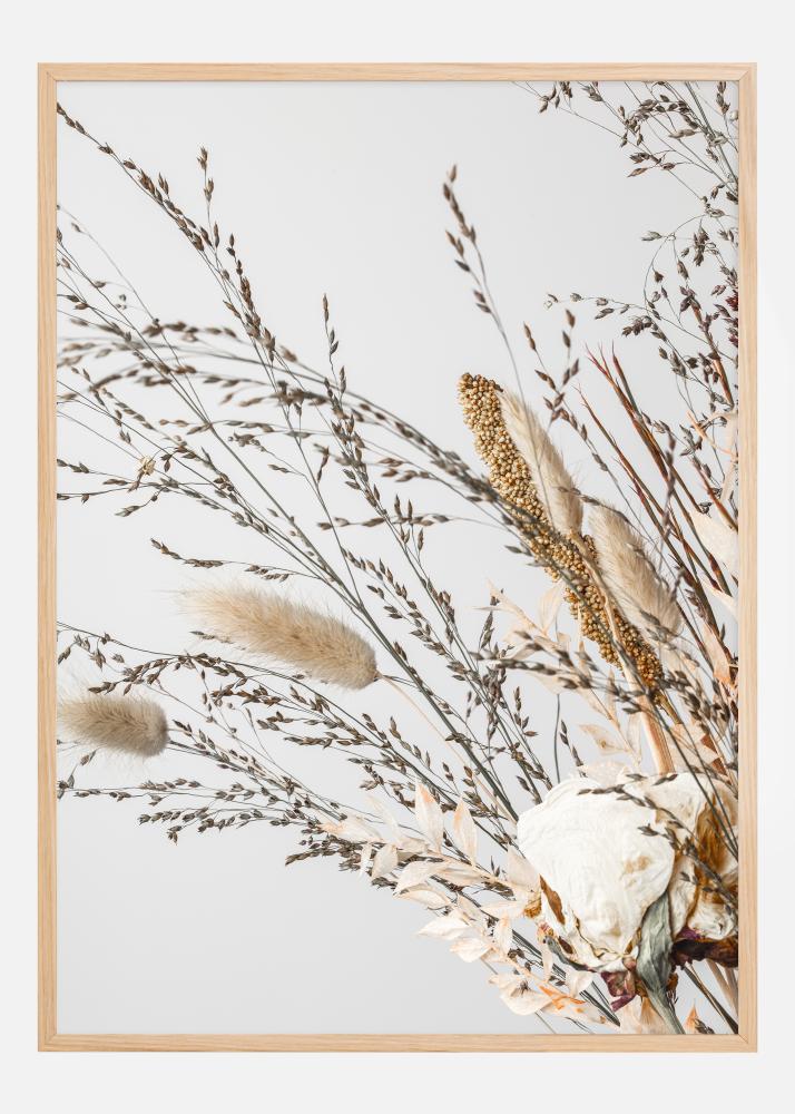 Αυτή η αφίσα είναι ένας εορτασμός της σιωπηλής κομψότητας της φύσης, παρουσιάζοντας μια ποικιλία από ξηρά φυτά. Η φυσική σύνθεση είναι γεμάτη με λεπτές γραμμές και οργανικές μορφές, από τα λυγισμένα χορτάρια έως τα ανθεκτικά στάχυα και τα διακριτικά χρωματισμένα φύλλα. Η καφέ-μπεζ παλέτα των ξερών φυτών ενάντια στο καθαρό λευκό φόντο προσφέρει μια αίσθηση ζεστασιάς και φύσης που αποτυπώνεται στη σιωπή.