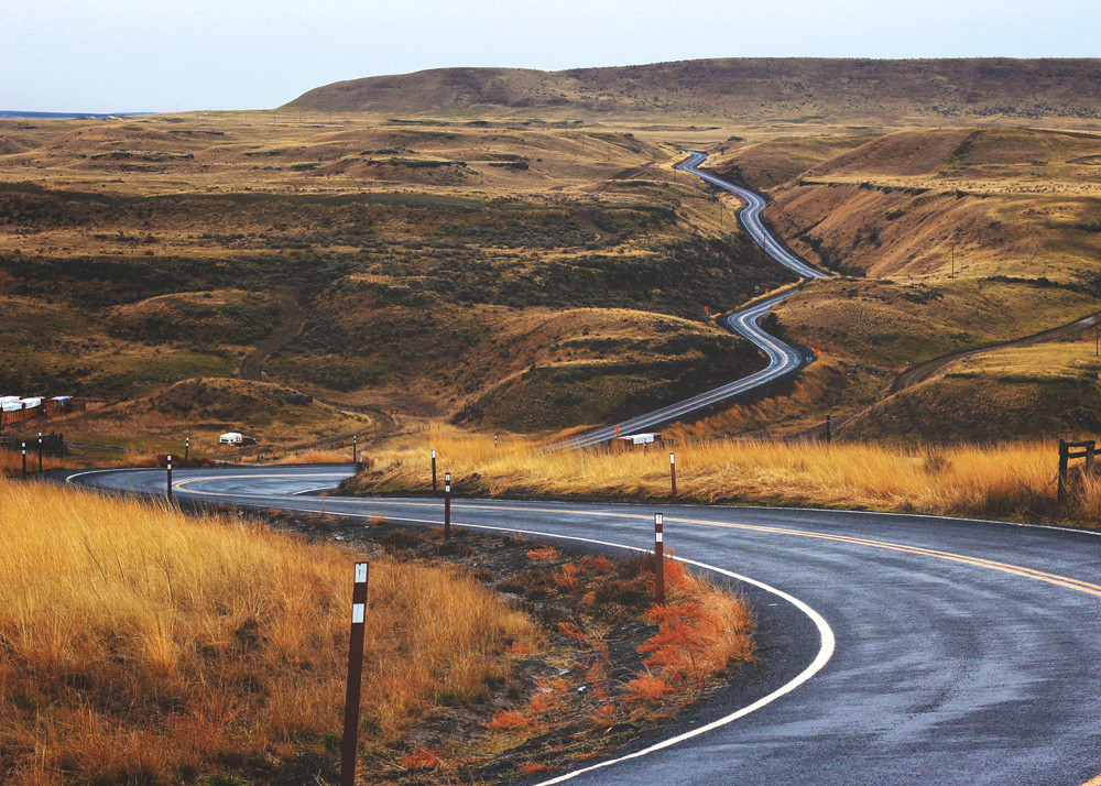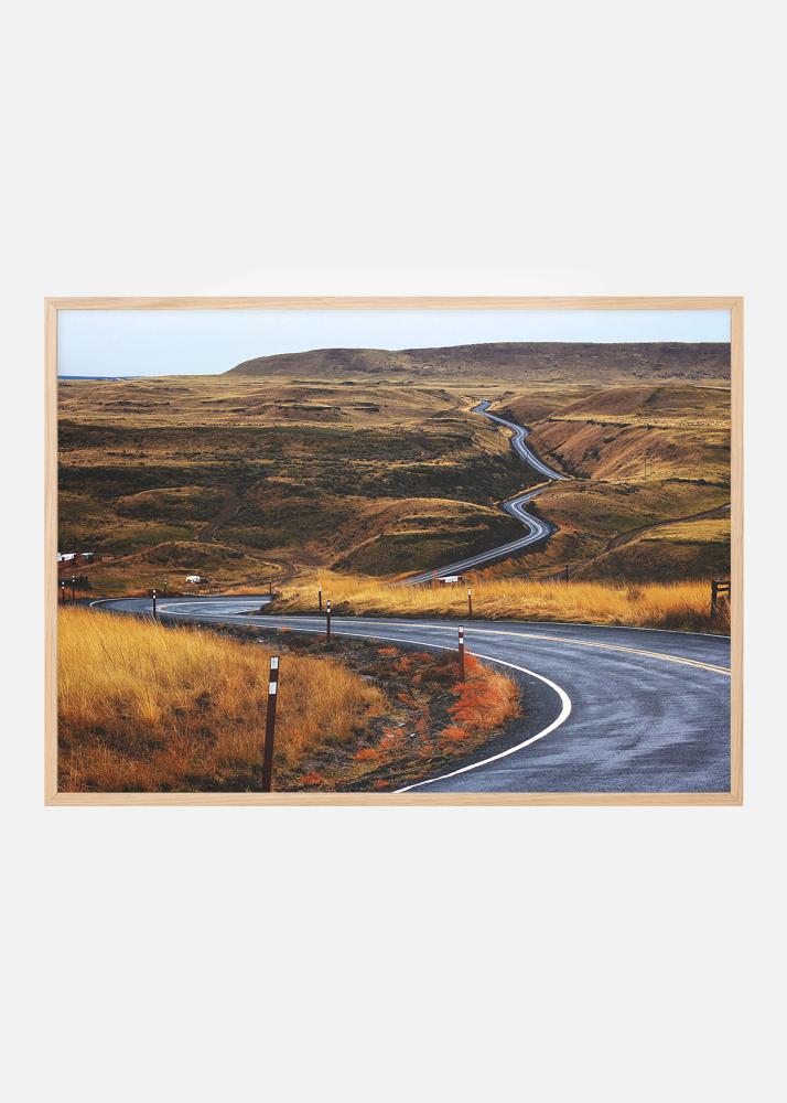 Αφίσα με έναν ασφάλτινο δρόμο που στριφογυρίζει μέσα από ένα ηλιοκαμένο τοπίο στέπας. Οι κιτρινωπές καφέ αποχρώσεις του χορταριού σε αντίθεση με το κρύο της ασφάλτου που διαχωρίζει το ανοιχτό τοπίο κάνουν το βλέμμα να εστιάζει στην εικόνα και να ακολουθεί τον δρόμο. Η αφίσα ταιριάζει καλά σε μια μινιμαλιστική κορνίζα, όπου το μοτίβο μπορεί να αναδειχθεί και μπορεί να συνδυαστεί με άλλα έργα τέχνης για ένα θέμα.