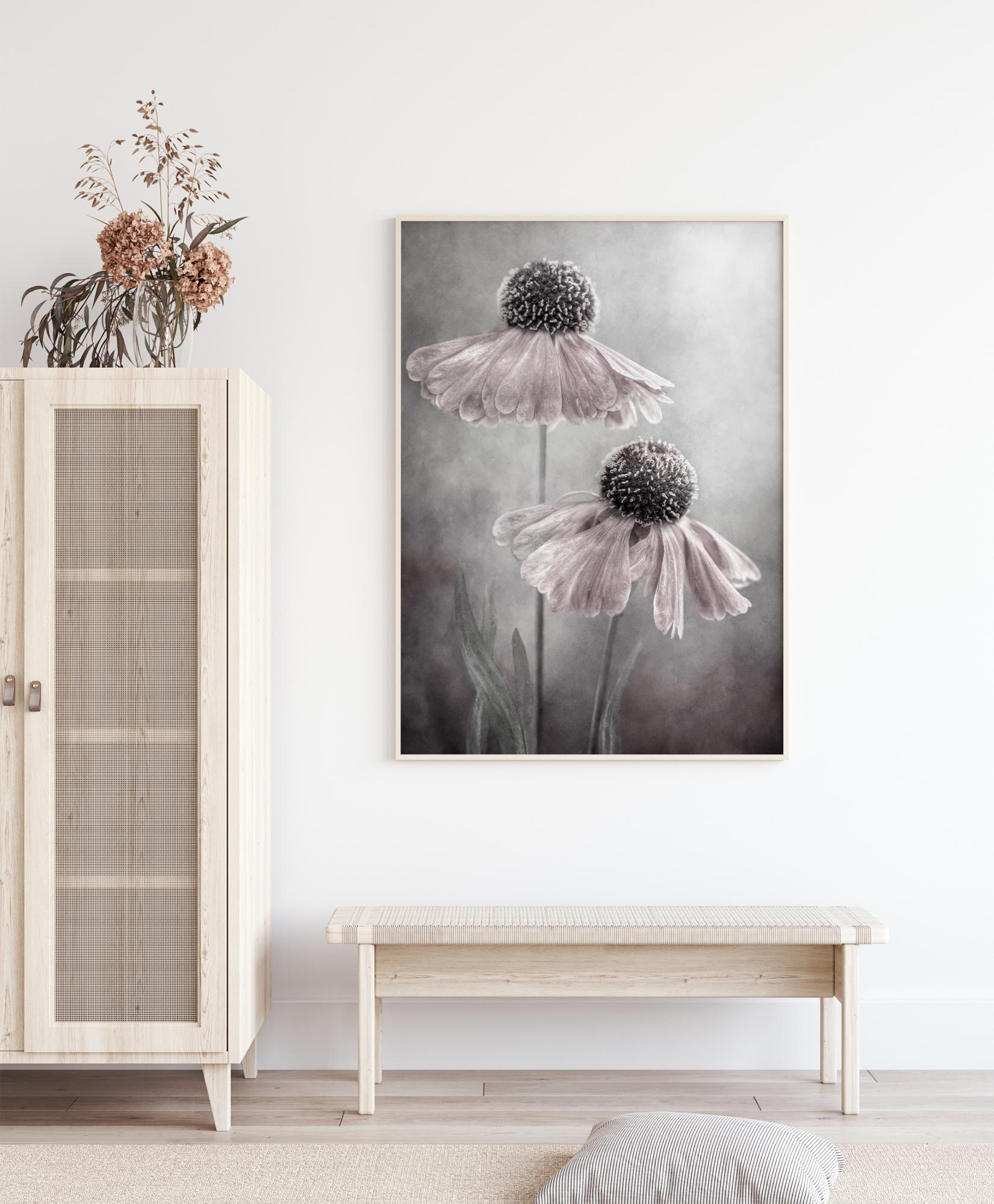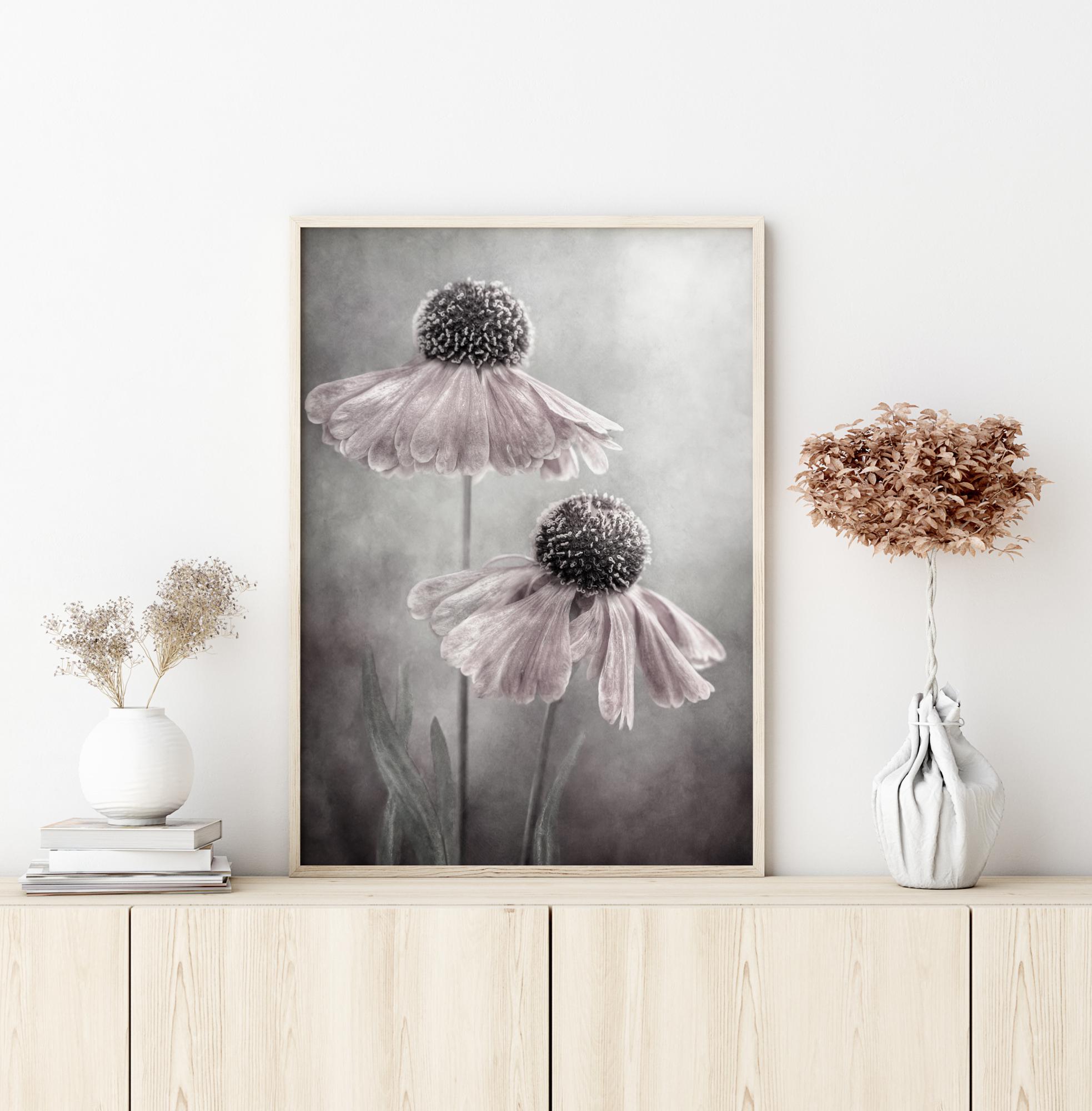 Μια όμορφη αφίσα με δύο μαργαρίτες που εκτείνονται προς τον ουρανό. Τα λευκά πέταλα στα κεφάλια των μαργαριτών κρέμονται από τη στρογγυλή μέση του λουλουδιού. Το υπόβαθρο είναι μια ομιχλώδης γκρίζα απόχρωση όπου το φως λάμπει για ατμόσφαιρα. Νιώστε τη μαγεία σε αυτήν την λεπτότητα της αφίσας όταν τη κρεμάσετε σε ένα υπνοδωμάτιο.