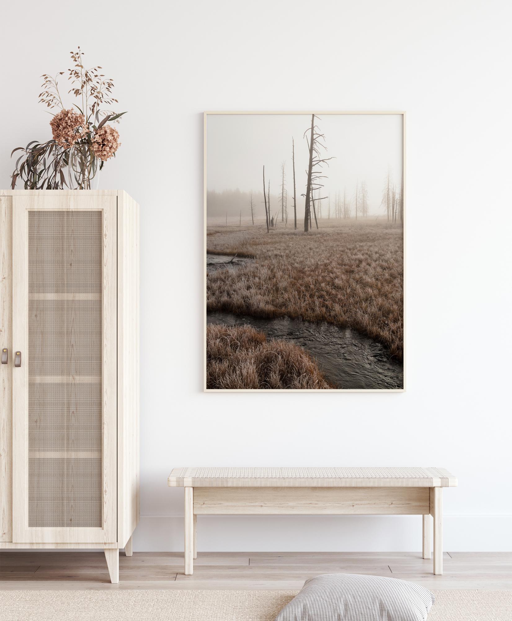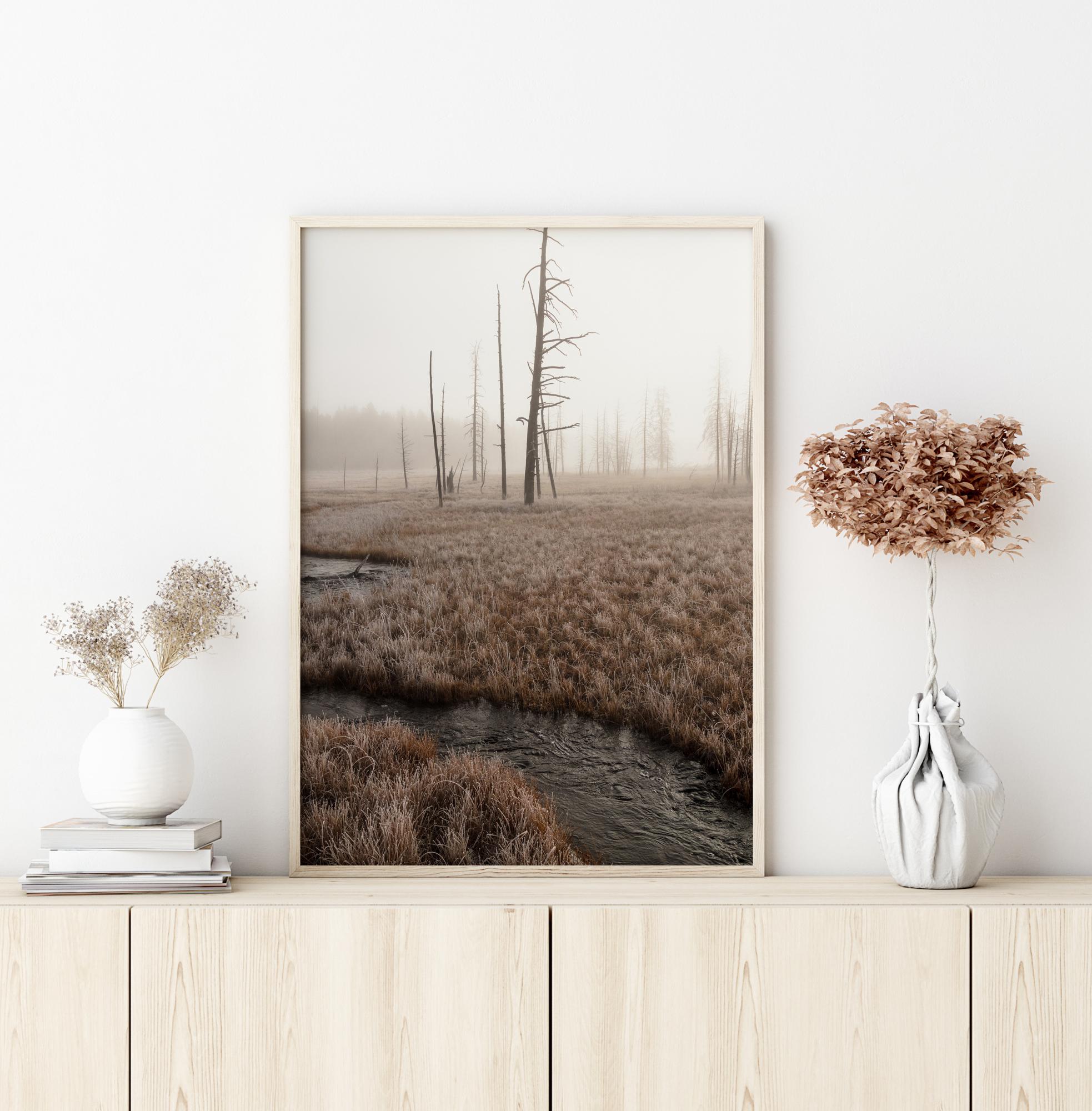 Μια μεταφυσική αφίσα τοπίου με μια πεδιάδα με νεκρά δέντρα και ένα ποτάμι που ρέει μέσα από αυτήν. Σε αυτήν τη φωτογραφία νωρίς το πρωί, η ομίχλη τυλίγει τα δέντρα και το κίτρινο γρασίδι. Ακολουθήστε το ποτάμι καθώς περιπλανιέται μέσα από το τοπίο μέχρι το μακρινό δάσος. Χάστε τον εαυτό σας σε έναν άλλο χρόνο και τόπο όταν κρεμάσετε αυτήν την αφίσα.