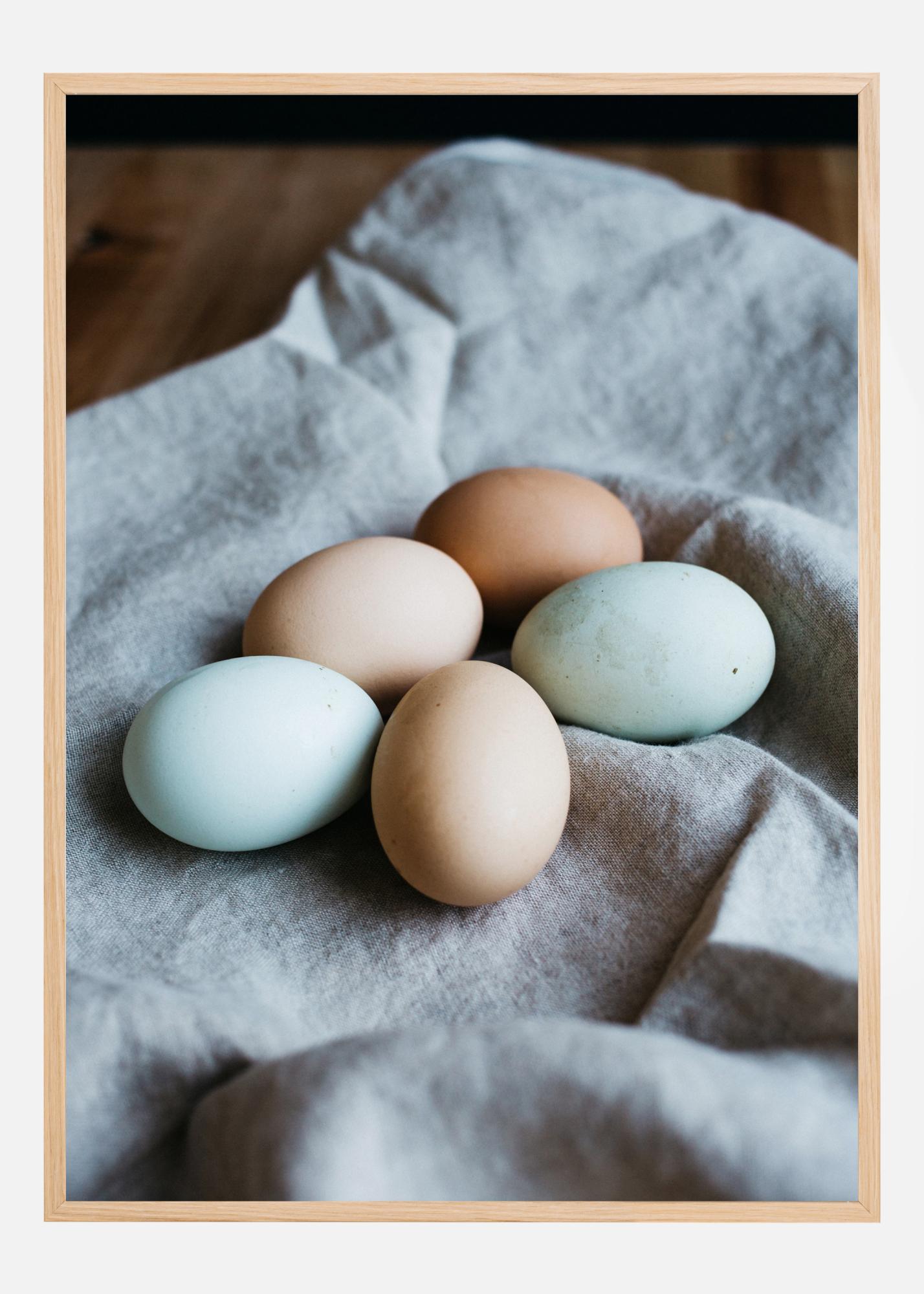 Μια αφίσα νεκρής φύσης με πέντε αυγά σε μια λευκή πετσέτα κουζίνας πάνω στο τραπέζι. Τα αυγά είναι σε διάφορες αποχρώσεις του καφέ και του λευκού και φαίνεται να είναι πρόσφατα γεννημένα. Οι θερμοί τόνοι δημιουργούν μια ρουστίκ αίσθηση όπου μπορείτε να εκτιμήσετε την φυσική ζωντανή ατμόσφαιρα. Ιδανικό για μια κουζίνα.