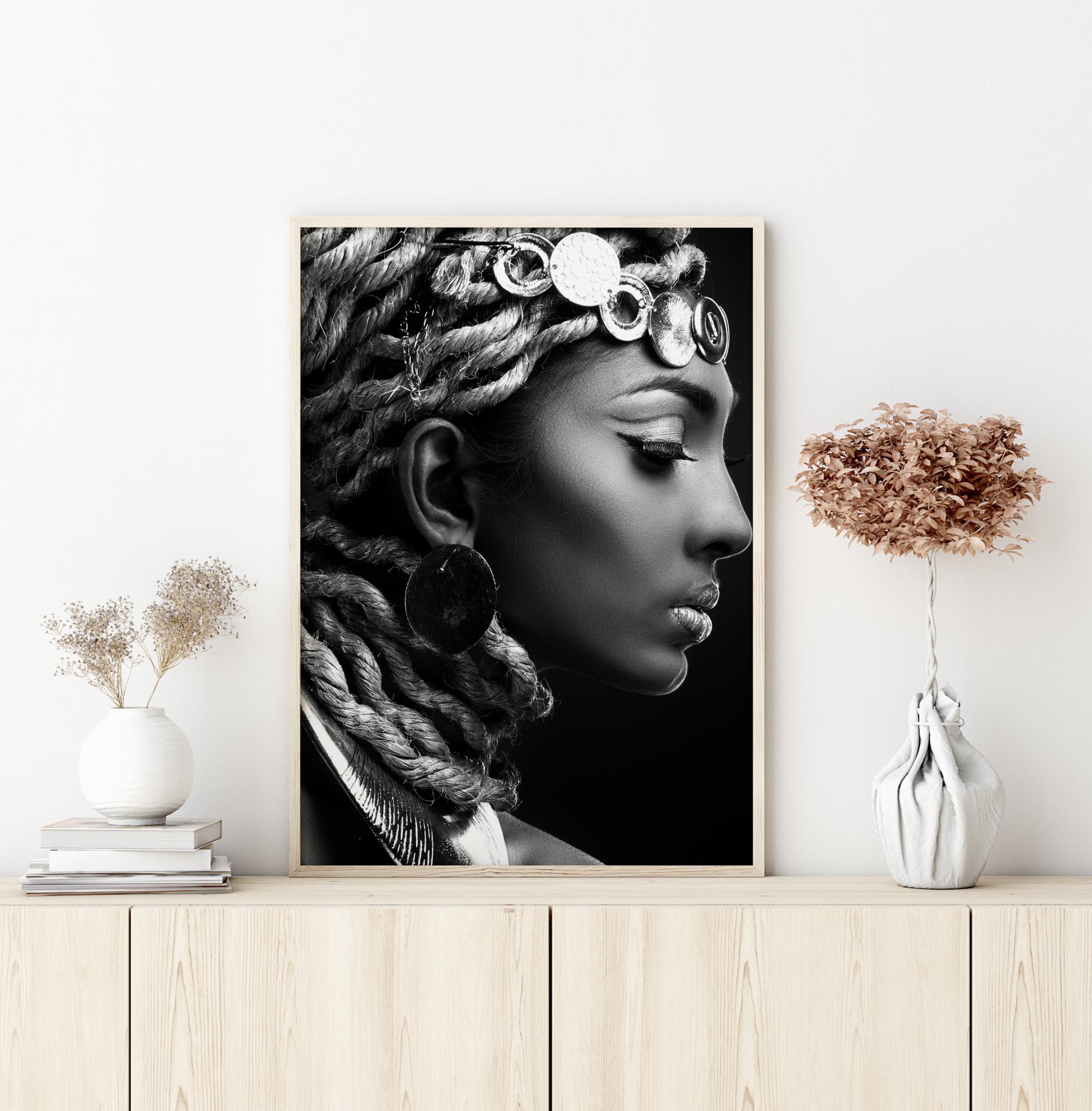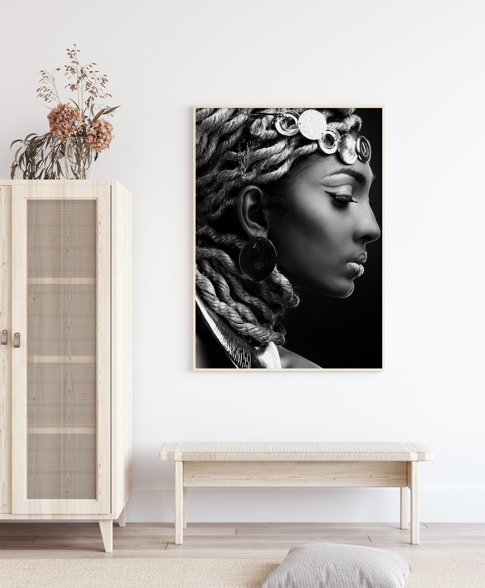 Μια φανταστική αφίσα πορτρέτου με το προφίλ μιας γυναίκας ντυμένης σε αρχαίο αιγυπτιακό στιλ. Αυτή η ασπρόμαυρη εικόνα δημιουργεί μια αίσθηση δράματος καθώς αυτή η όμορφη γυναίκα κοιτάζει αλαζονικά προς τα κάτω. Το κεφάλι της, τα αυτιά της και ο λαιμός της είναι καλυμμένα με μεγάλα χρυσά κοσμήματα, ένα σύμβολο πλούτου. Αφήστε τον εαυτό σας να εμπνέεται κάθε μέρα από αυτή τη δυνατή γυναίκα.