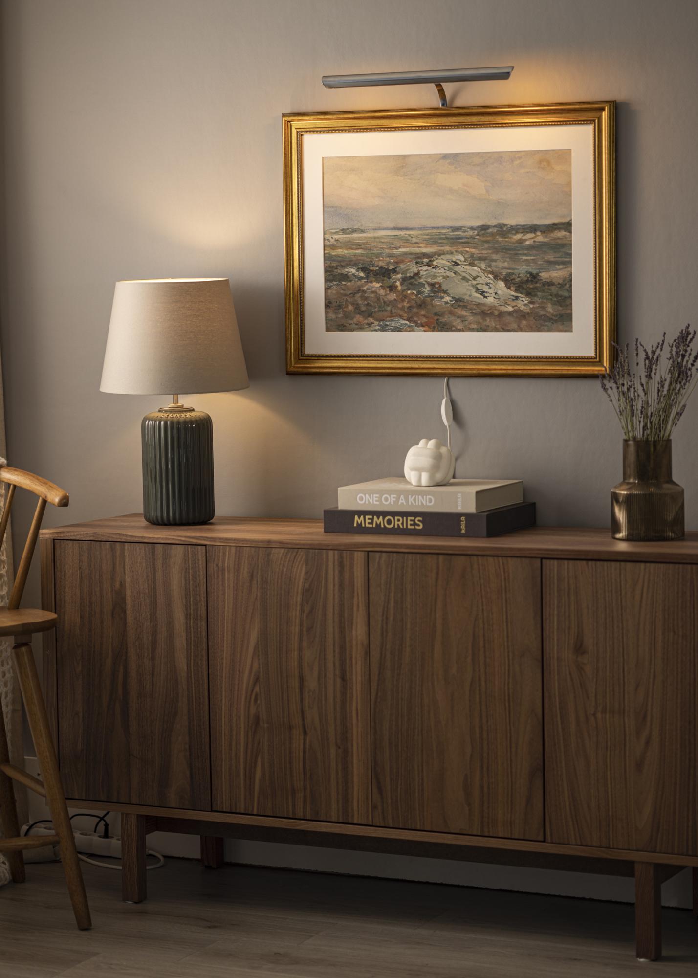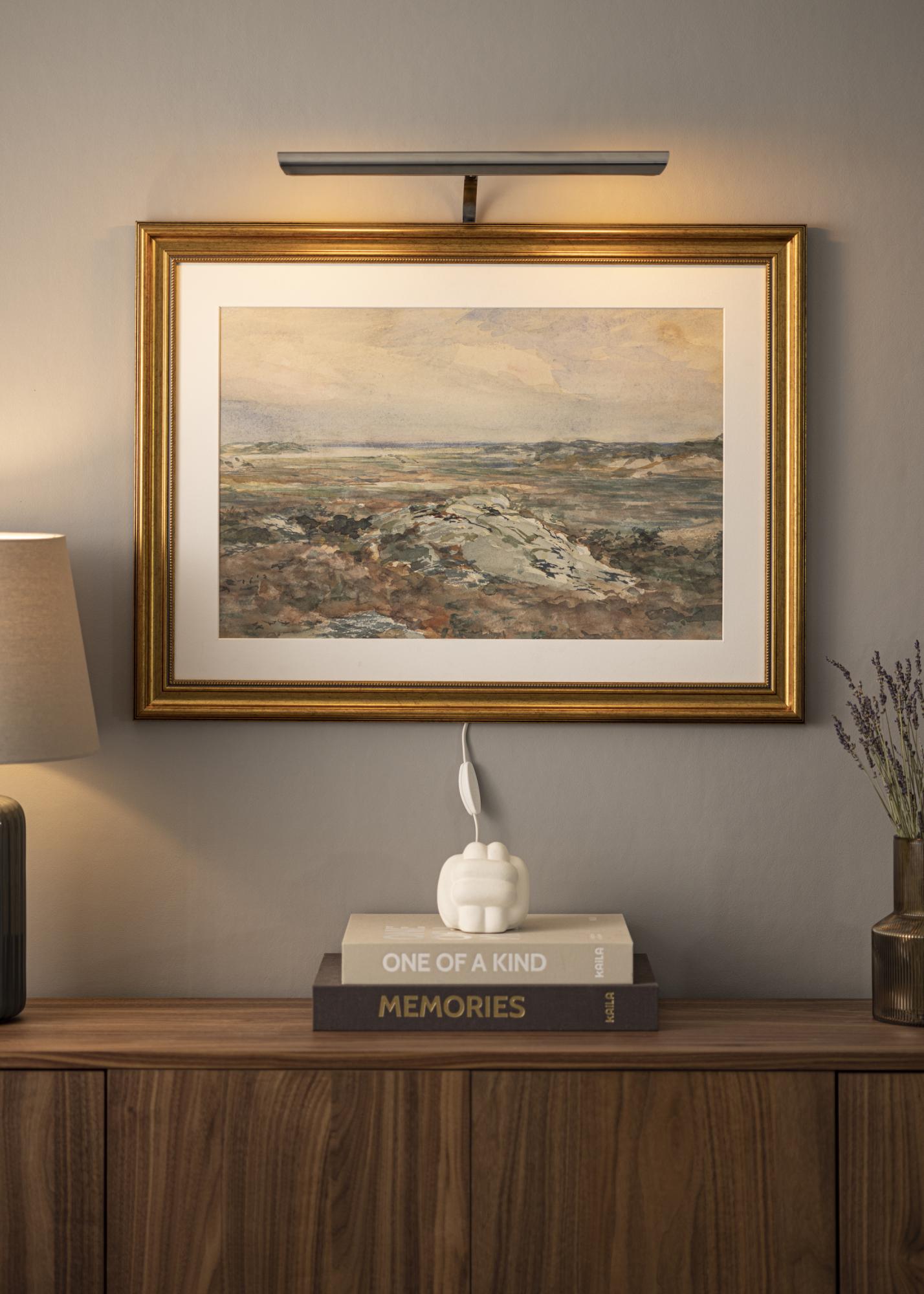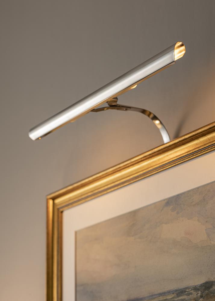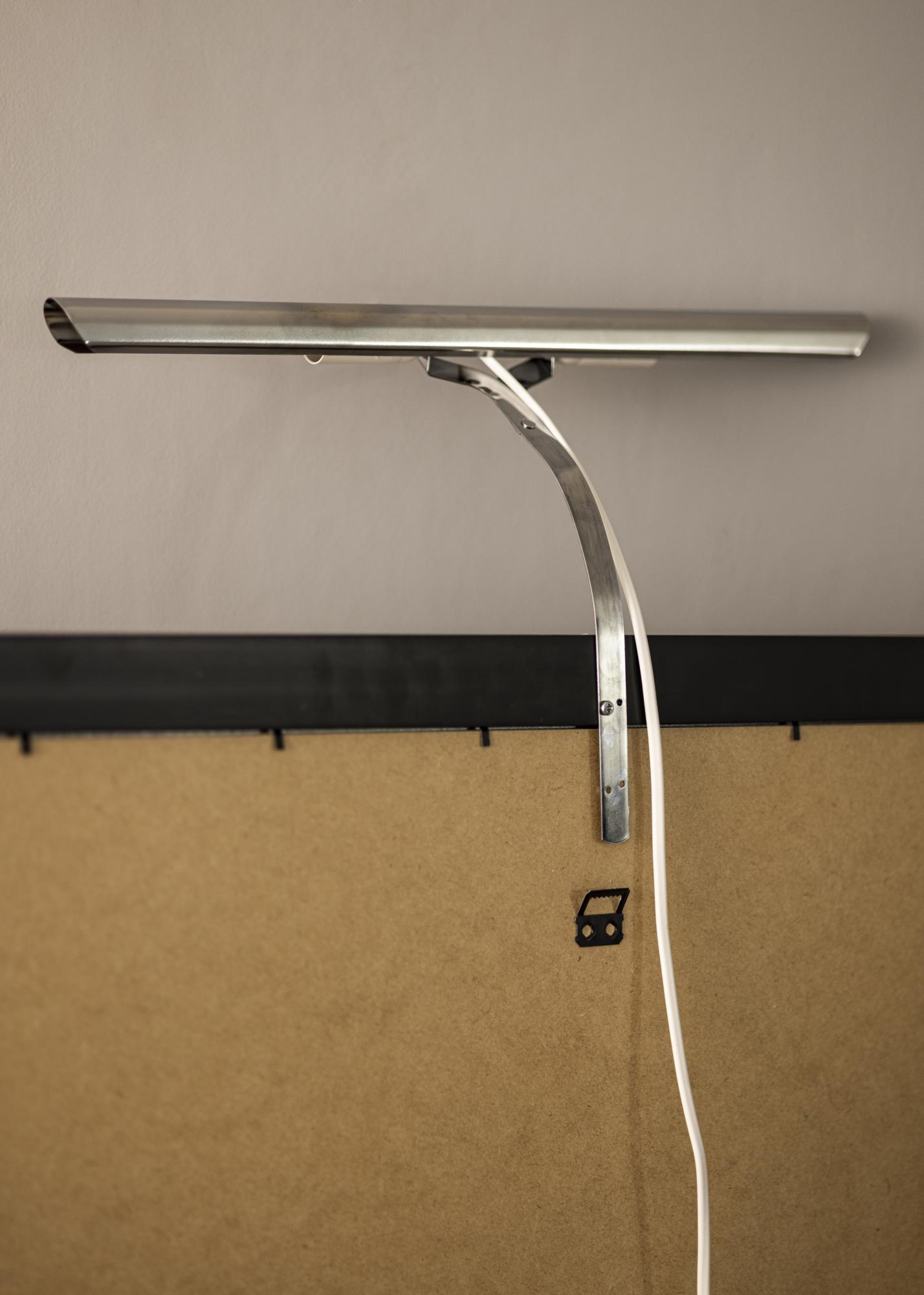 Κανονικά τοποθετείς το φωτισμό για πίνακες στο πίσω μέρος της κορνίζας, το μειονέκτημα είναι ότι απαιτείται μια ξύλινη κορνίζα (ορισμένες συνθετικές κορνίζες επίσης λειτουργούν) που έχει ένα φαρδύ προφίλ για να είναι δυνατό να βιδωθεί στην κορνίζα. Με το δικό μας εξάρτημα τοίχου αποφεύγεις να σκέφτεσαι αυτό και απλώς τοποθετείς το φωτισμό για πίνακες απευθείας στον τοίχο πίσω από τον πίνακα.