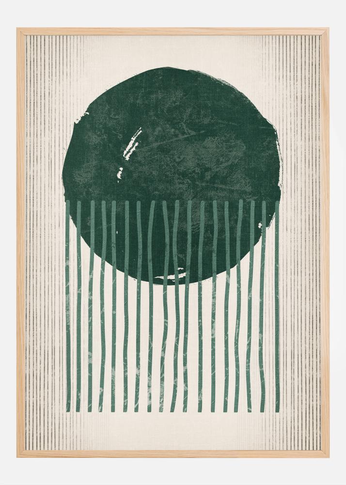 Αυτή η αφίσα προσκαλεί σε μια φαντασιακή εξερεύνηση του θαλάσσιου κόσμου, με μια στιλιζαρισμένη εικόνα που παραπέμπει σε μια μέδουσα με τα ρέοντα πλοκάμια της. Το δυναμικό κυκλικό σχήμα σε σμαραγδένιο πράσινο είναι και καθηλωτικό και χαλαρωτικό, ενώ οι λευκογραμμένες, κάθετες γραμμές που αποτελούν τα 'πλοκάμια' δημιουργούν μια αίσθηση κίνησης. Αυτή είναι μια καλλιτεχνική ερμηνεία που συνδυάζει αφηρημένη μορφή με βιολογική φαντασία και προσφέρει μια μοναδική, σύγχρονη στροφή στο θαλάσσιο θέμα.