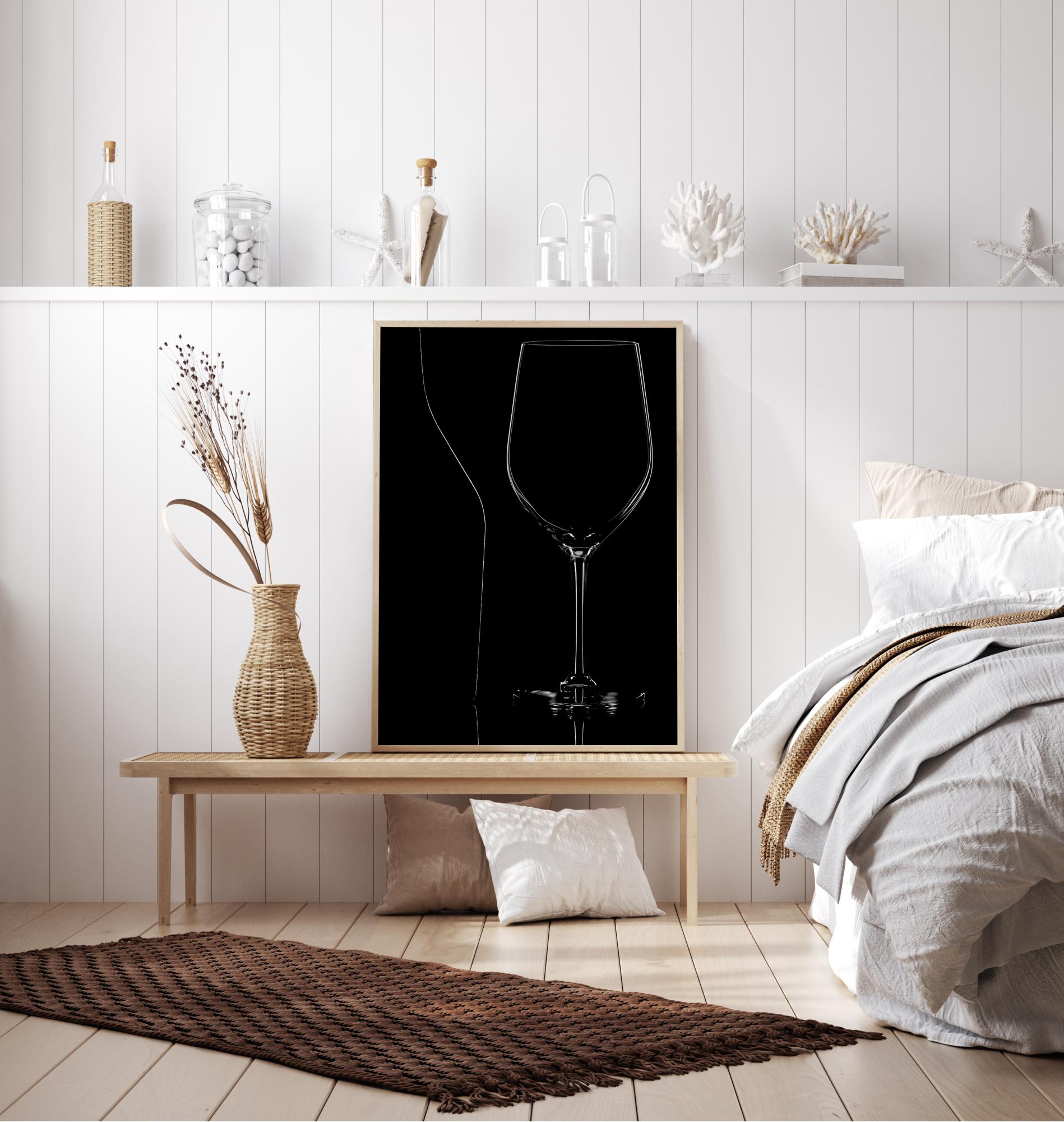 Μια κομψή αφίσα με ένα ποτήρι κρασιού σε μαύρο φόντο. Αυτή η αφηρημένη εικόνα αποπνέει κλάση καθώς βλέπετε μόνο το ποτήρι με τη βοήθεια του ανακλώμενου φωτός γύρω από τις άκρες. Ταιριάξτε αυτή με έναν λευκό τοίχο για να διατηρήσετε την δραματική κομψότητα.