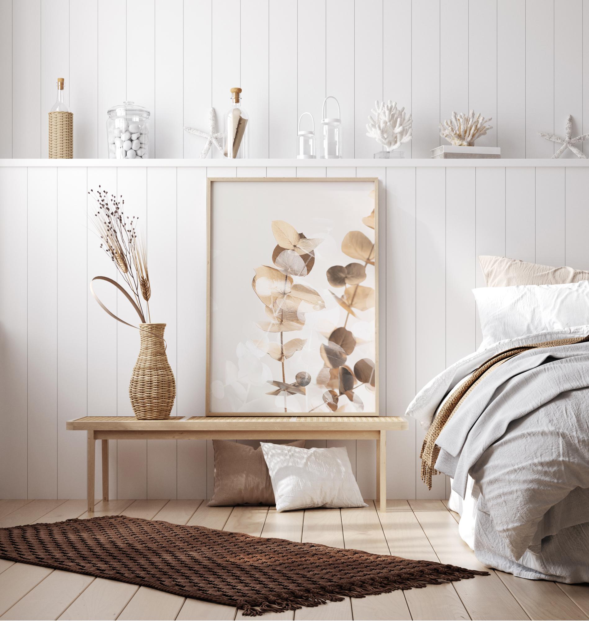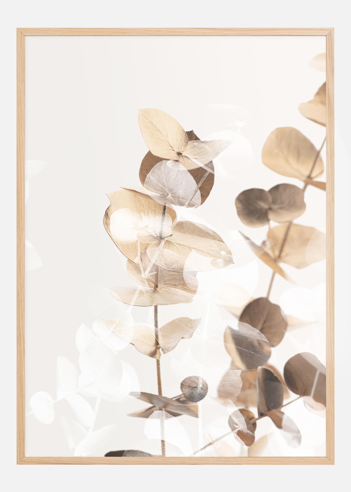Μια χρυσαφένια αφίσα με φύλλα και κλαδιά ευκαλύπτου. Τα χρυσαφί και καφέ φύλλα ξεχωρίζουν με μια λαμπερή μορφή στο απλό λευκό φόντο. Για να ενισχύσετε αυτά τα φύλλα, ταιριάξτε με έναν παρόμοιο χρυσό ή σκούρο κρεμ χρωματιστό τοίχο για επιπλέον κομψότητα.